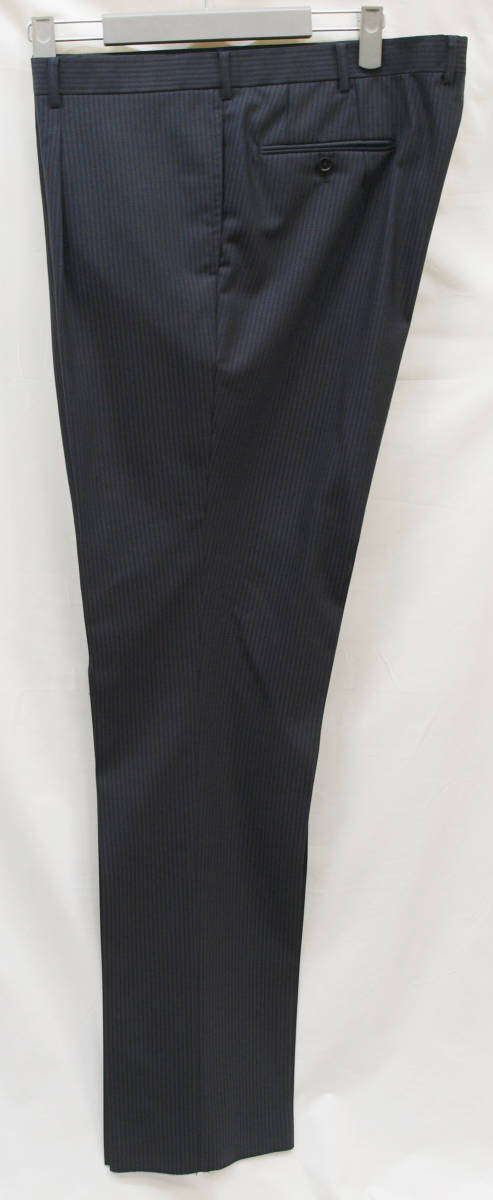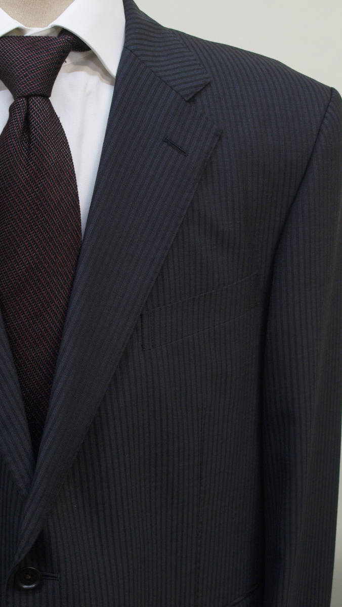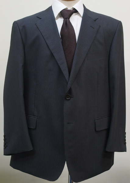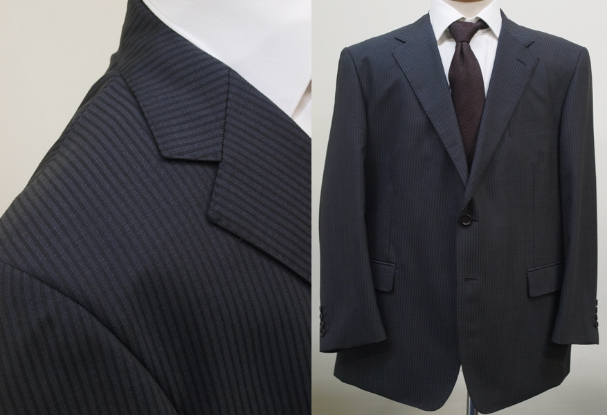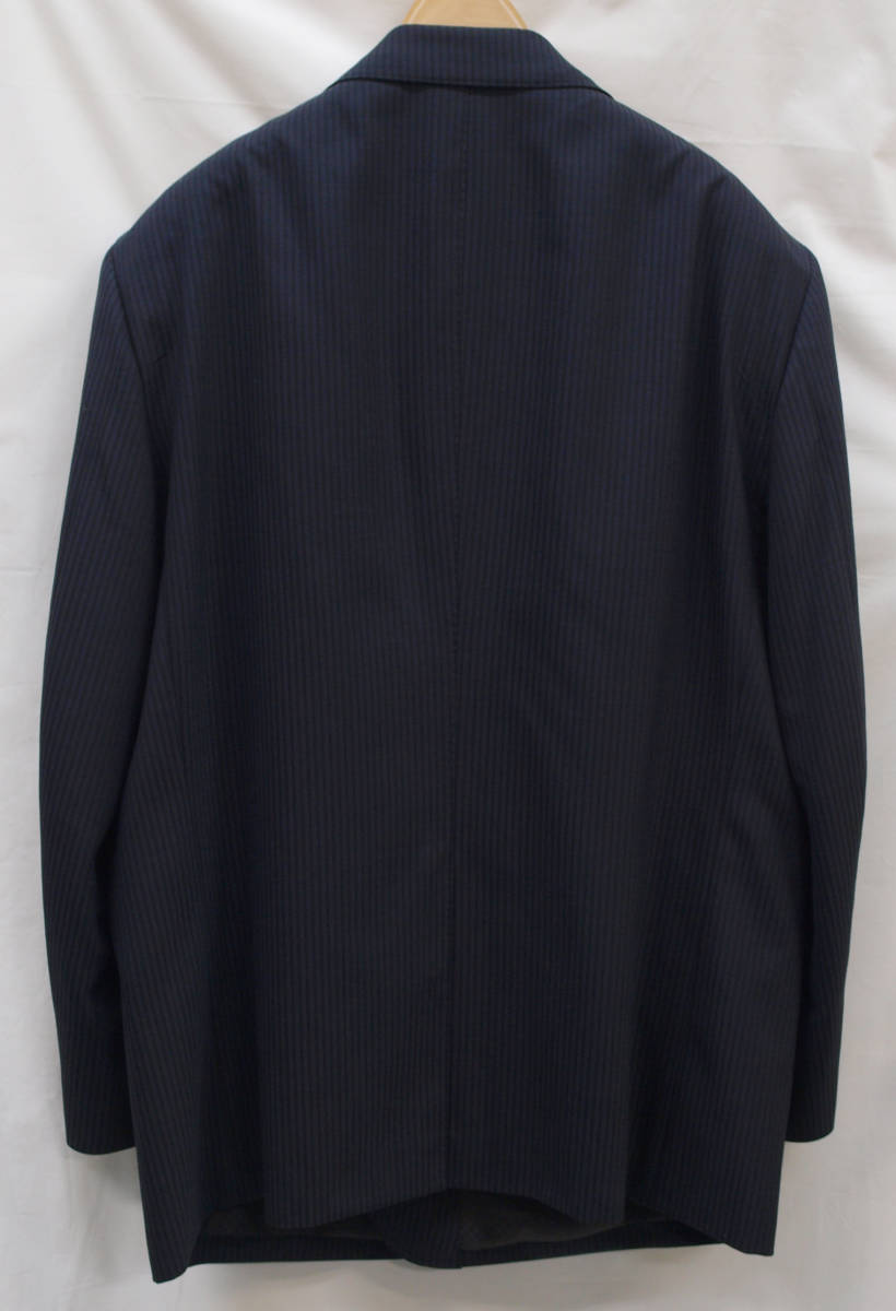 【サイズ】 K7(大きいサイズ/ビッグサイズ) 目安の体型 身長175cm~185cm、ウエストサイズ113cm前後 【ジャケット実寸】 肩幅51.5cm 着丈77.5cm 袖丈63cm 脇下部分64cm 身幅63cm 【パンツ実寸】 ウエスト(胴回り実寸)113cm わたり幅39.5cm(股下10cmの部位で35.5cm) 裾幅23.7cm 脇股上31cm 前股上33.5cm 股下94cm(裾上げしていない状態/新品) 【素材】 表地:ウール50% ポリエステル50% 裏地:胴裏/ポリエステル100% 袖裏/キュプラ100% 夏向けほど透け感がなく厚みがあり、冬向けと比べるとやや薄手の適度な厚みのオールシーズン向け紳士スーツ用のウールブレンド素材を使用 【色】 ダークグレー 【柄】 黒にちかい濃いグレー色地にミディアムグレーのラインがはいったストライプ 【デザイン】 ほどよいゆとりのある着心地のシングル2つボタンスーツ、レギュラーフィット、ビジネススーツ新品、裾上げしていない状態です。 ・ジャケットはシングル2つボタンでややゆとりがある着用感のベーシックレギュラーモデル ・パンツは股上は浅くなく普通で、適度なゆとりをもたせたレギュラーフィット、1タックパンツ ご着用の地域にもよりますが真夏を除くほぼオールシーズン対応商品 【縫製仕様】 ・ジャケットはシングル2つボタン、ノッチドラペル、襟縁等AMFステッチ入り、袖口ボタン4つ、センターベント、内ポケット4つ(小ポケット2つ含む)、背抜き(秋冬春物) ・パンツはワンタック、膝裏当て付き、脇ポケット縦付け、後ろポケット両玉縁で左のみボタン付き、フロントはファスナーでボタン&ホック仕様/うちかけボタンあり、シロセット加工(パンツ折り目加工) 細部にわたりきちんとしたビジネス仕様の縫製仕立てで仕上がっております。