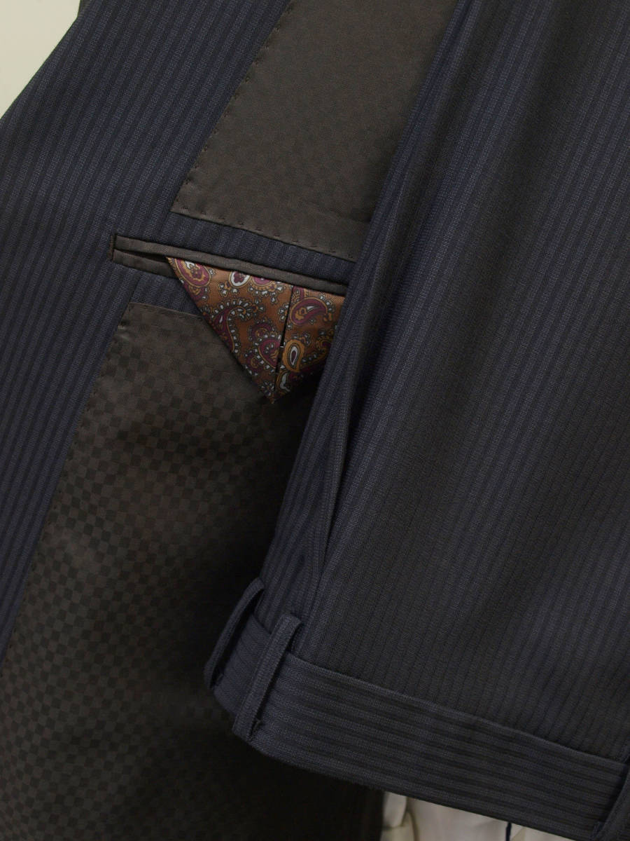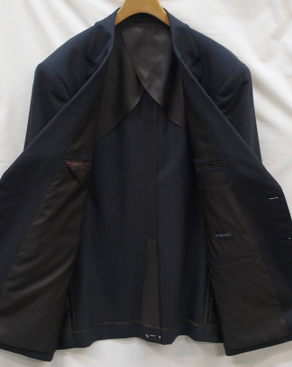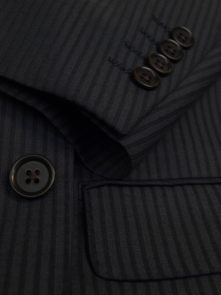 【サイズ】 K7(大きいサイズ/ビッグサイズ) 目安の体型 身長175cm~185cm、ウエストサイズ113cm前後 【ジャケット実寸】 肩幅51.5cm 着丈77.5cm 袖丈63cm 脇下部分64cm 身幅63cm 【パンツ実寸】 ウエスト(胴回り実寸)113cm わたり幅39.5cm(股下10cmの部位で35.5cm) 裾幅23.7cm 脇股上31cm 前股上33.5cm 股下94cm(裾上げしていない状態/新品) 【素材】 表地:ウール50% ポリエステル50% 裏地:胴裏/ポリエステル100% 袖裏/キュプラ100% 夏向けほど透け感がなく厚みがあり、冬向けと比べるとやや薄手の適度な厚みのオールシーズン向け紳士スーツ用のウールブレンド素材を使用 【色】 ダークグレー 【柄】 黒にちかい濃いグレー色地にミディアムグレーのラインがはいったストライプ 【デザイン】 ほどよいゆとりのある着心地のシングル2つボタンスーツ、レギュラーフィット、ビジネススーツ新品、裾上げしていない状態です。 ・ジャケットはシングル2つボタンでややゆとりがある着用感のベーシックレギュラーモデル ・パンツは股上は浅くなく普通で、適度なゆとりをもたせたレギュラーフィット、1タックパンツ ご着用の地域にもよりますが真夏を除くほぼオールシーズン対応商品 【縫製仕様】 ・ジャケットはシングル2つボタン、ノッチドラペル、襟縁等AMFステッチ入り、袖口ボタン4つ、センターベント、内ポケット4つ(小ポケット2つ含む)、背抜き(秋冬春物) ・パンツはワンタック、膝裏当て付き、脇ポケット縦付け、後ろポケット両玉縁で左のみボタン付き、フロントはファスナーでボタン&ホック仕様/うちかけボタンあり、シロセット加工(パンツ折り目加工) 細部にわたりきちんとしたビジネス仕様の縫製仕立てで仕上がっております。