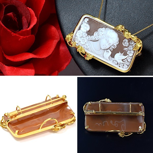 ■商品説明 気品のある女性と、美しい花、そして可愛らしい小鳥のペンダント兼ブローチです。素敵なリーフの装飾が施されている枠は、高級素材18金を使用しております。 通常ではあり得ないお値段ですがオークション特別価格としてご用意させて頂きました。早い者勝ちですのでお早めにどうぞ。 ■商品詳細 【地金】 K18 【使用石】 シェルカメオ 【大きさ】 約21.3mm × 約41.5mm(本体部分) この商品写真は 0.7mmのベネチアンチェーンで撮影しております *こちらの商品はペンダントトップの価格であり、チェーンは別売りとなります。チェーンも合わせてご購入希望の方は下記一覧表よりお好みの長さ太さでお選び頂けます。ご落札後の取引ナビにてご連絡下さい ■発送詳細 【ヤマト宅急便60サイズ】 送料は こちら 【レターパックプラス】 送料は こちら 2点以上ご購入の方は送料無料 目安としてご入金確認後5日以内に発送(一部お時間がかかる商品もございます) サイズ直しをご希望の場合はプラス1週間程度のお時間がかかります。 ■お支払い方法 Yahoo!かんたん決済 ■リングサイズ直し料金 リングは有料にてサイズ直しが可能です。±3号までは3,000円、それ以上はデザインによって可能不可能もございますのでご相談下さい。サイズ直しにはプラス一週間前後のお時間がかかります。 ■注意事項 イメージ違い、入札間違い等のお客様都合によるキャンセルや返品は承っておりませんのでよくご確認の上ご入札下さいませ。サイズ直しや加工をしたものは返品不可となります。 石や真珠などは天然のため傷やインクルージョン、エクボ等が多少ございます。 こちらの商品は店頭や他ルートでも販売中です。十分に気を付けてはいますが稀に注文が重なってしまうケースが想定されます。ご落札頂いてもお取引できない可能性もあるとご了承下さいませ。質問欄より在庫確認をいただけますと確実です。 その他特記事項や連休中の発送について自己紹介欄に記載する場合があります。お手数ですがご確認のうえご入札下さい。 |