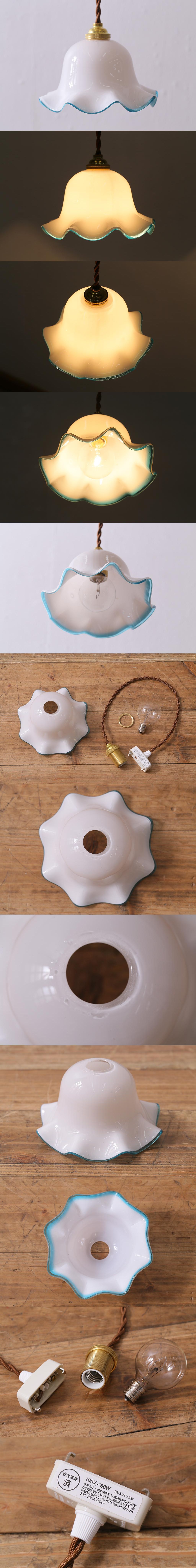 R-040810 ヴィンテージ照明 イギリスビンテージ 小振りな水色縁フリルのミルクガラスペンダントライト(ランプシェード、天井照明)
