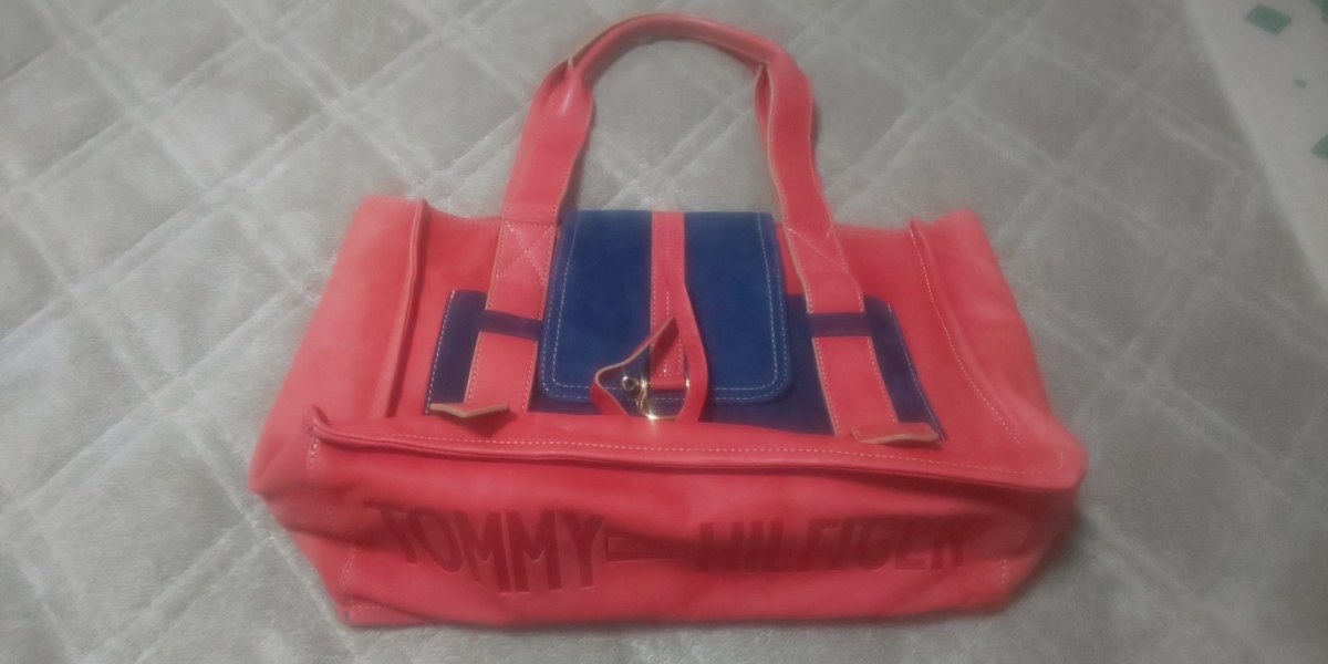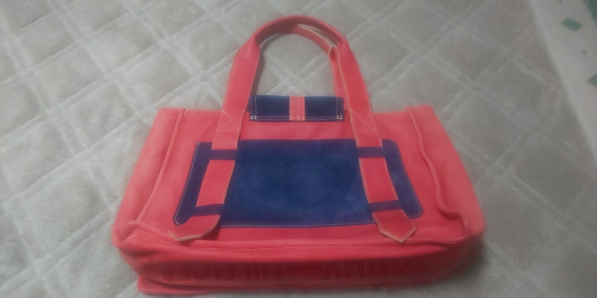 トートバッグ 革製 赤色+紺色 サイズ 縦25cm 横35cm 幅13cm中古品で汚れ等使用感あります