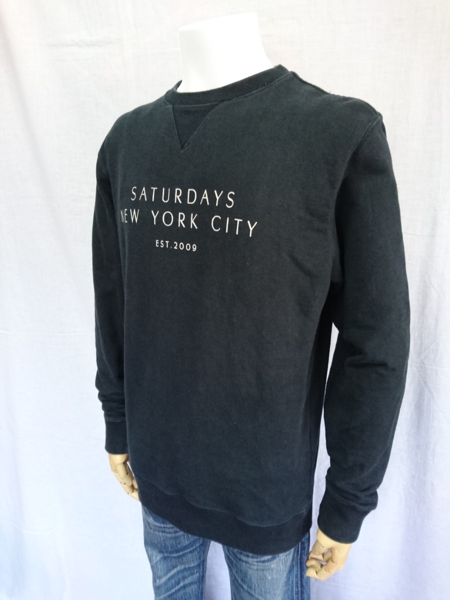 Saturdays surf nycのロゴ トレーナーになります。多少の使用感あります。全体的には綺麗ですが、古着ですので使用による目立たない程度の小さなシミやダメージは御座います。致命的なダメージは御座いません。シンプルで無駄のない大人なお洒落デザインです。厚くも薄くもない、オールシーズン対応出来る生地です。早い者勝ちです!!