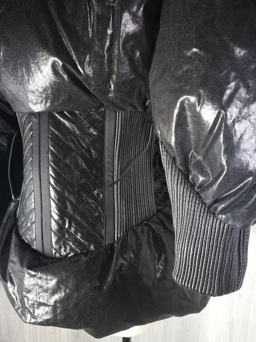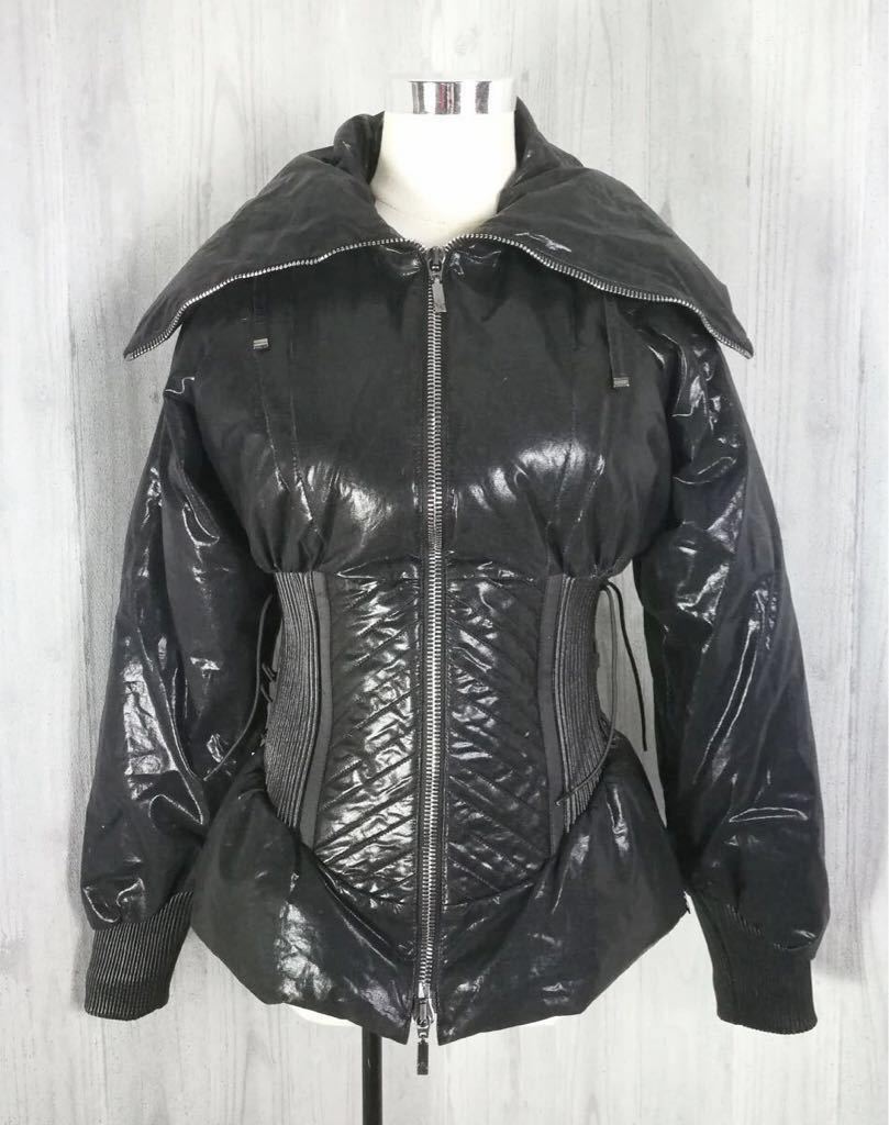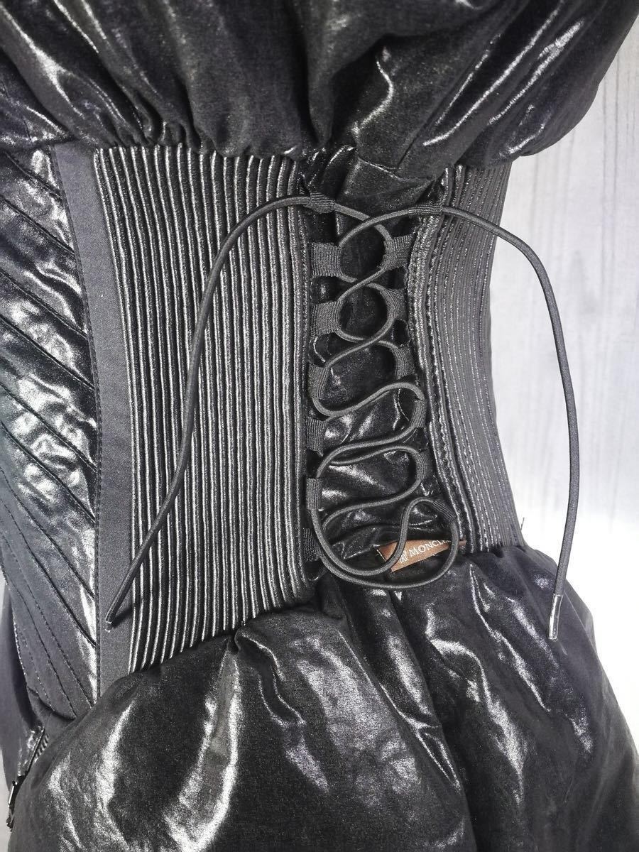 モンクレールの中でも最も高級なラインであるブラウンタグのアイテムです。 非常に斬新で上品なディテールを持っている国内でも販売数が少ない希少なデザインのアイテムです。 ウエスト部分がコルセットのようなデザインになっており、襟も変形でとてもお洒落です。 コルセットはサイドがゴムで編み上げになっているためお好きなシルエットに調整可能です。 生地は若干光沢感のあるブラックで女性的かつ上品です。 袖口やウエスト部分などのディテールはレザー切り替えとなっております。 定価は45万程度だったかと思います。
