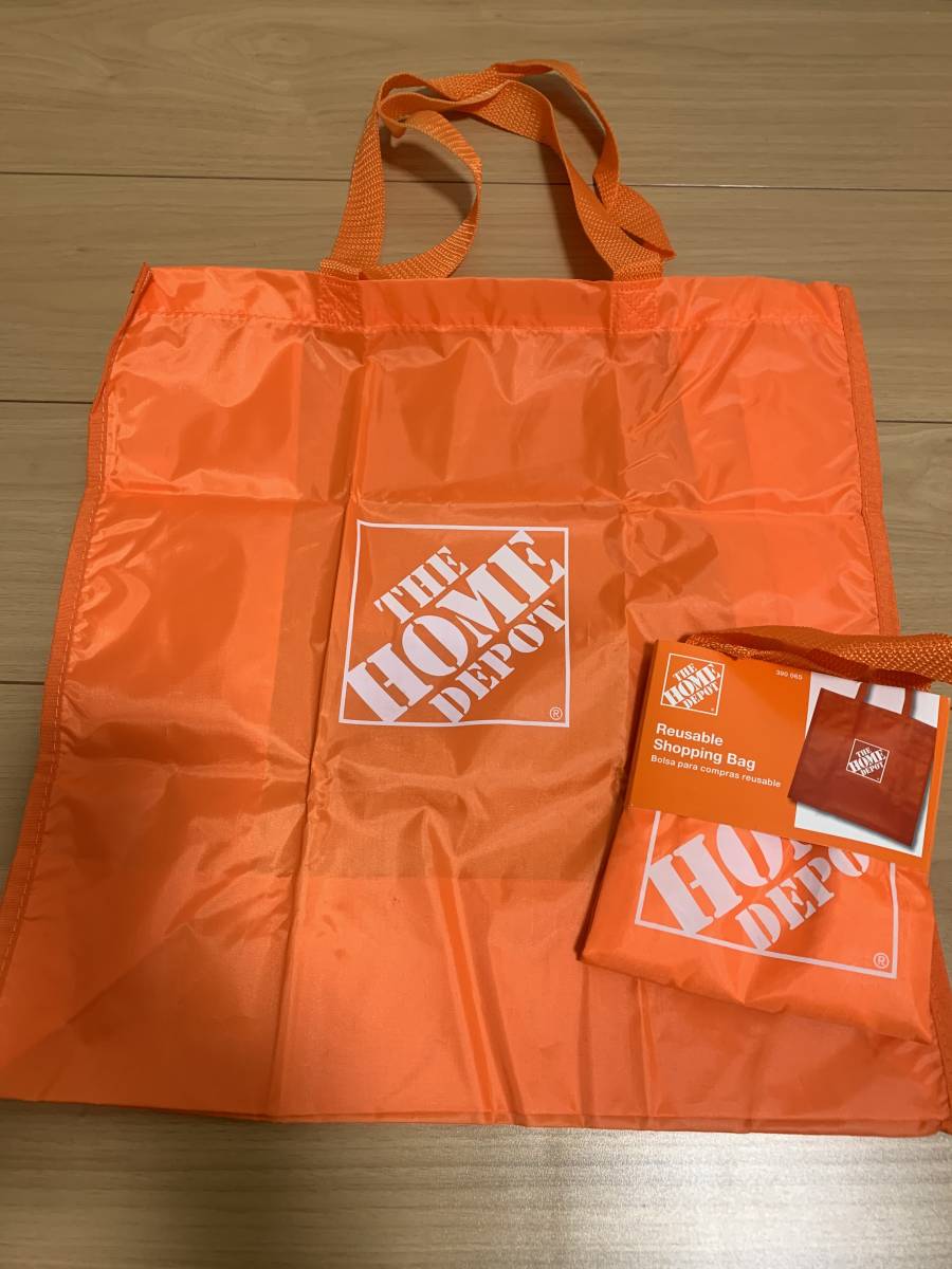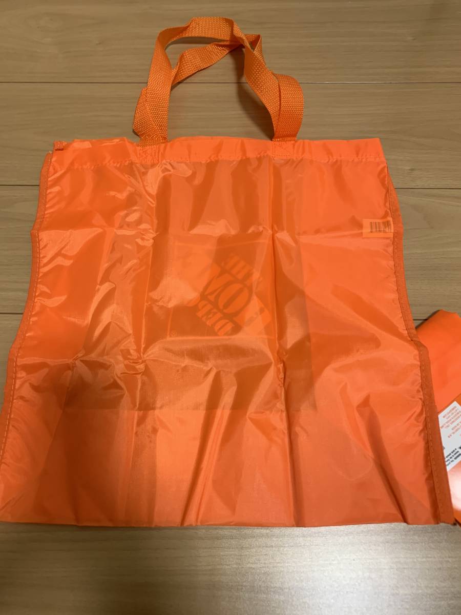 新品 カラーはオレンジにホワイトのロゴのデザインプリントです。アメリカで有名なホームセンターのエコバッグです。しっかりとした作りです。サイズは横40cm縦39cmマチ18.5cm持ち手全長48cm幅は2.5cmです。
