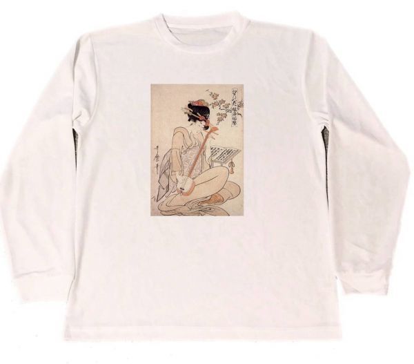 喜多川歌麿 江戸の花 娘浄瑠璃 ドライ Tシャツ 三味線 グッズ   ロング Tシャツ ロンT 白