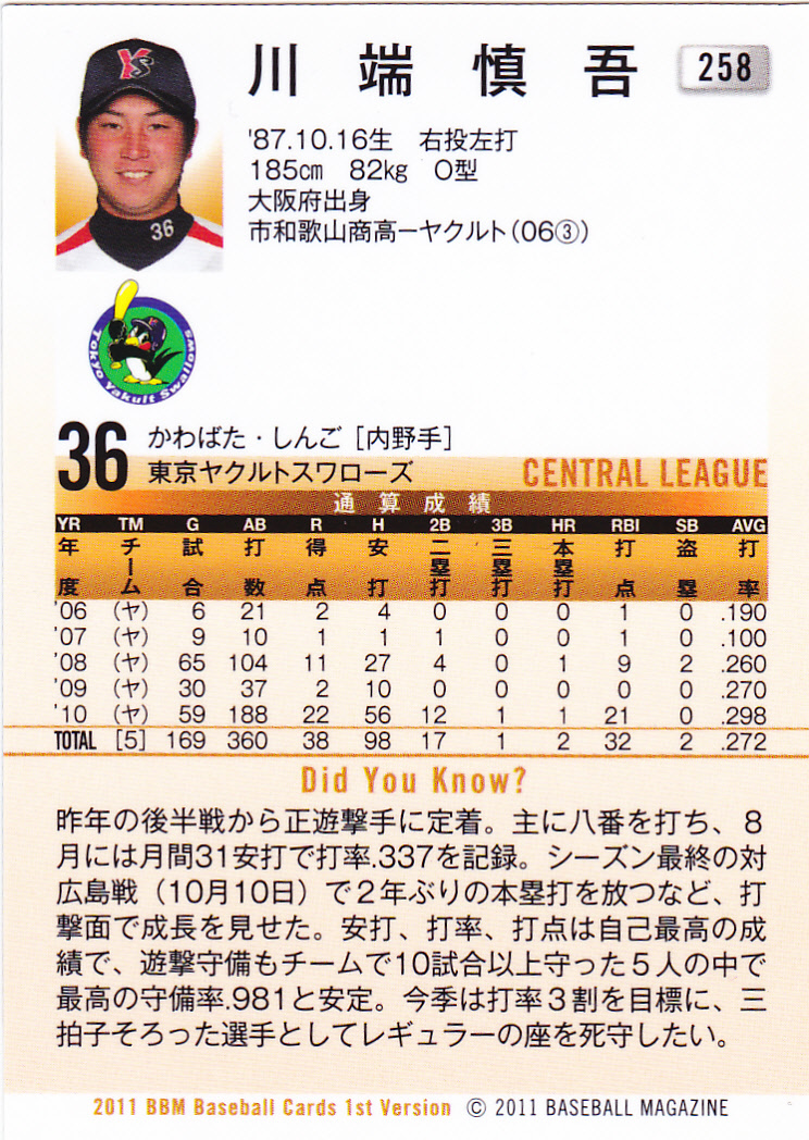 2011BBMベースボールカード1st 258 川端慎吾 ヤクルト 大阪府 和歌山商業高校