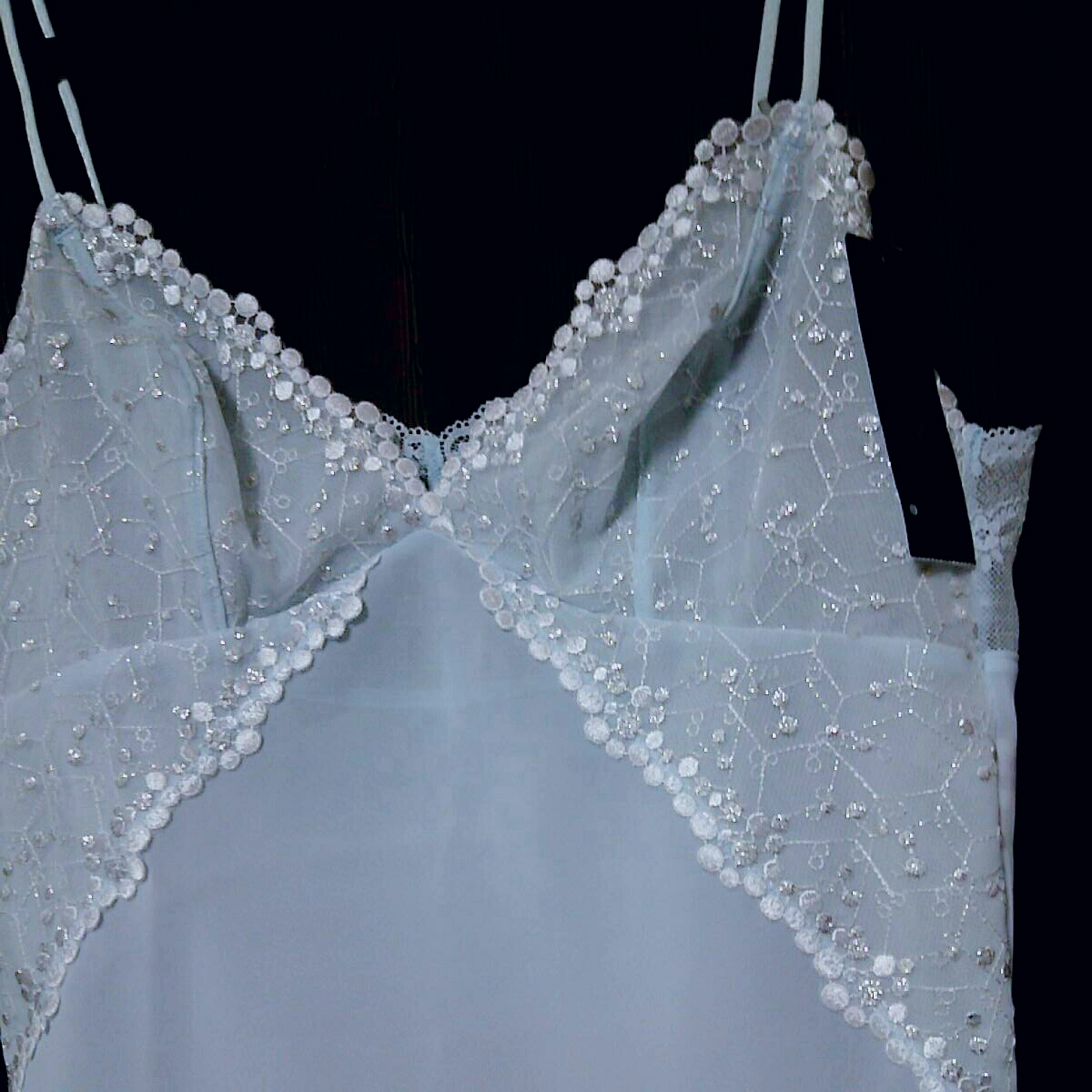 全体的に透ける生地になっており、写真の色だと青っぽいのですが、薄い水色になります。