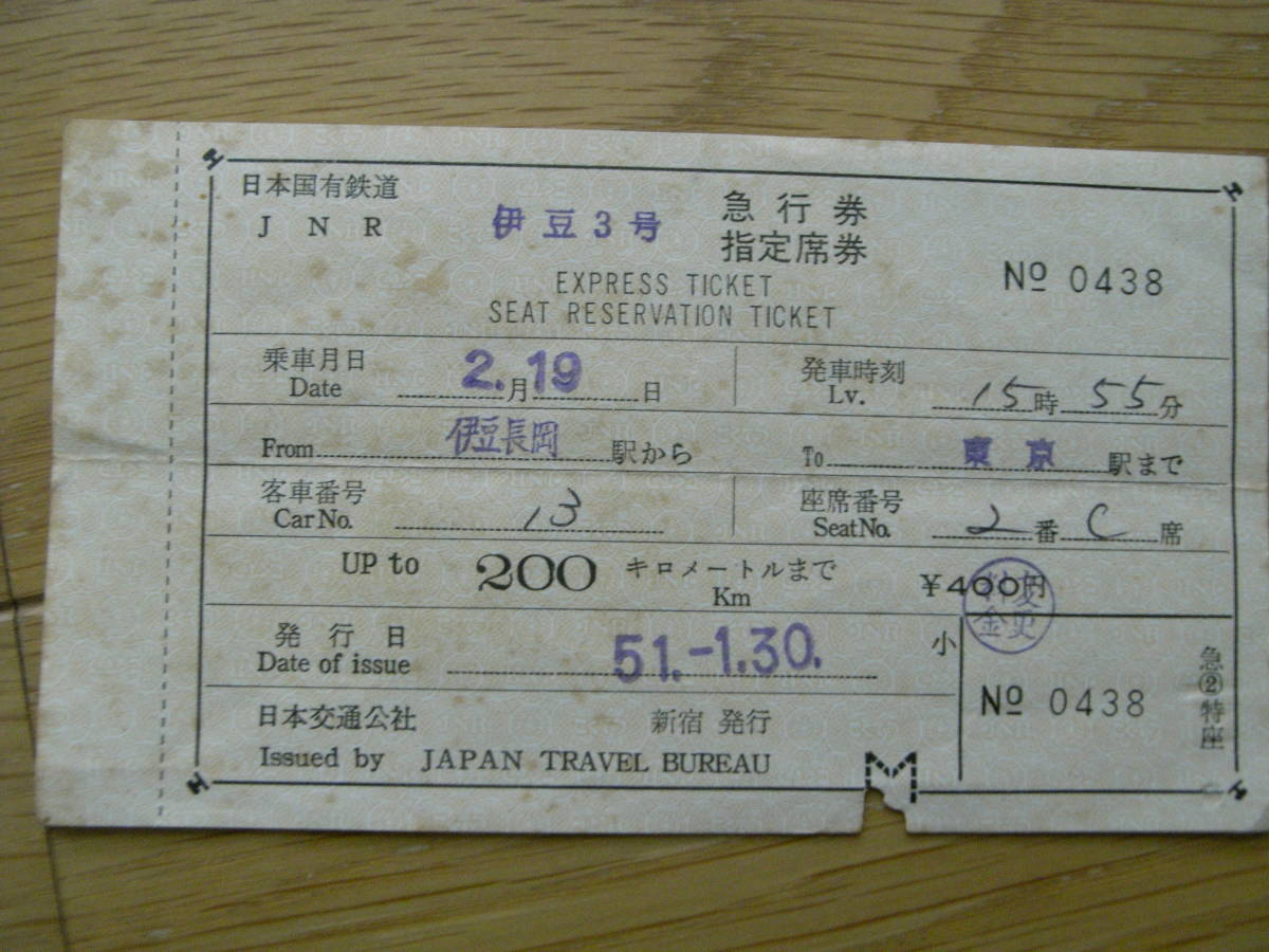 伊豆3号 急行券 指定席券 伊豆長岡駅から東京駅まで 発行日 昭和51年1月30日 日本交通公社新宿発行