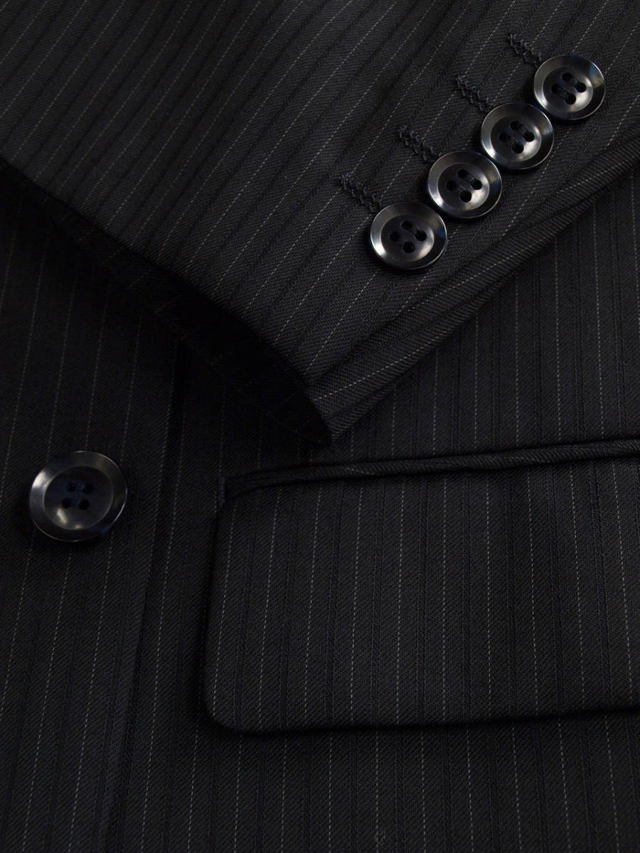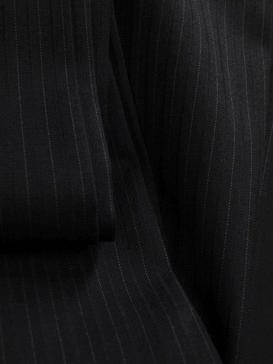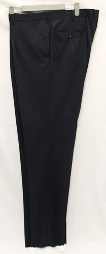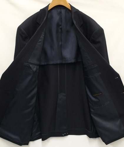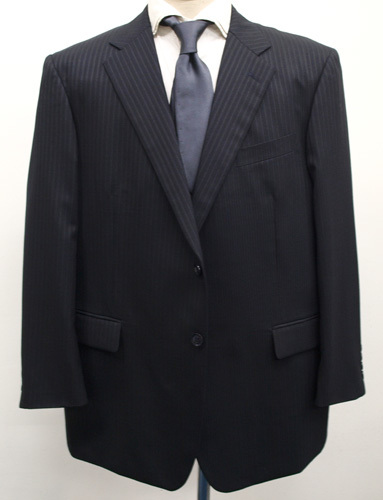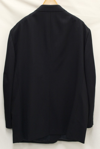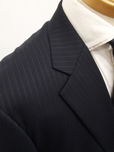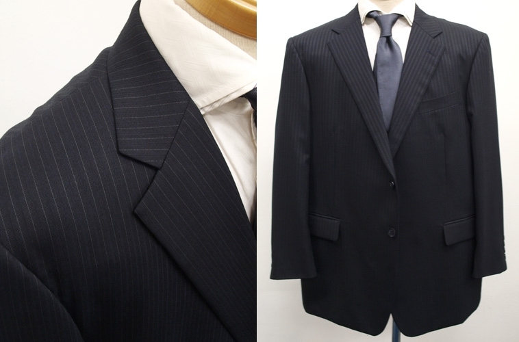 【サイズ】 K5(大きいサイズ/ビッグサイズ) 目安の体型 身長165cm~175cm、ウエストサイズ107cm前後 【ジャケット実寸】 肩幅49.5cm 着丈73cm 袖丈59.5cm 脇下部分61cm 身幅60cm 【パンツ実寸】 ウエスト(胴回り実寸)107cm わたり幅38cm(股下10cmの部位で34.5cm) 裾幅23.2cm 脇股上30cm 前股上32.5cm 股下90cm(裾上げしていない状態/新品) 【素材】 表地:ウール99% ポリエステル1% 裏地:胴裏/ポリエステル100% 袖裏/キュプラ98%ポリエステル2% 夏向けほど透け感がなく厚みがあり、冬向けと比べるとやや薄手の適度な厚みのオールシーズン向け紳士スーツ用のウール素材を使用 【色】 黒色にちかい濃紺色 【柄】 地と同色の織ストライプと薄いグレーのラインが4mm間隔で交互にはいったストライプ柄 【デザイン】 ほどよいゆとりのある着心地のシングル2つボタンスーツ、レギュラーフィット、ビジネススーツ新品、裾上げしていない状態です。 ・ジャケットはシングル2つボタンでややゆとりがある着用感のベーシックレギュラーモデル ・パンツは股上は浅くなく普通で、適度なゆとりをもたせたレギュラーフィット、1タックパンツ ご着用の地域にもよりますが真夏を除くほぼオールシーズン対応商品 【縫製仕様】 ・ジャケットはシングル2つボタン、ノッチドラペル、袖口ボタン4つ、センターベント、内ポケット4つ(小ポケット2つ含む)、背抜き(秋冬春物) ・パンツはワンタック、膝裏当て付き、脇ポケット縦付け、後ろポケット両玉縁で左のみボタン付き、フロントはファスナーでボタン&ホック仕様/うちかけボタンあり 細部にわたりきちんとしたビジネス仕様の縫製仕立てで仕上がっております。
