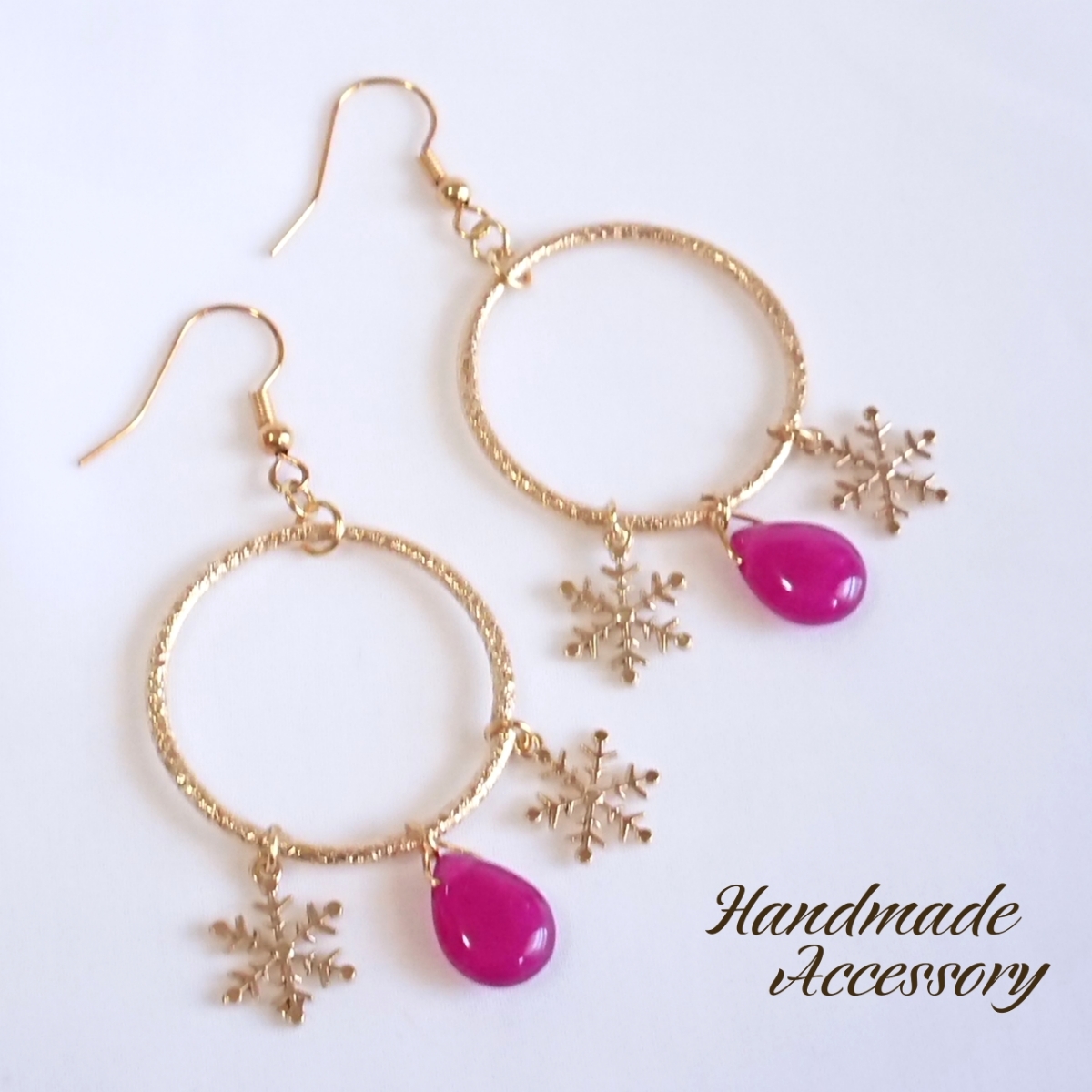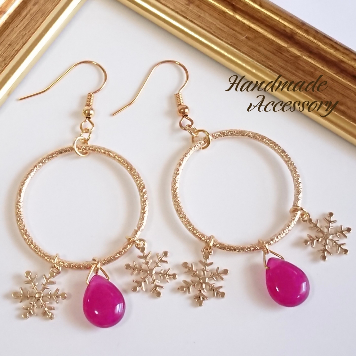 上品な華やかさのあるワインレッドジェードの雫に左右のゴールドカラーの雪の結晶パーツがフープの下でゆらゆらと揺れて顔まわりをパッと華やかに魅せてくれます♪