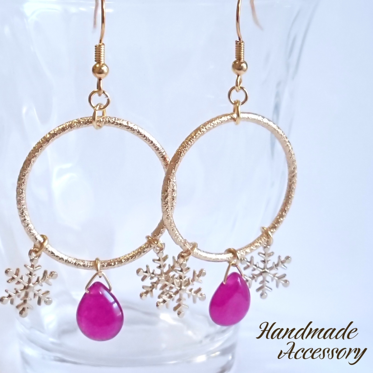 大きめのデザインフープの下にワインレッドジェードの雫と雪の結晶パーツを連ねたフープピアスです。