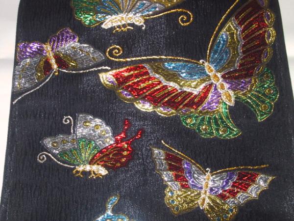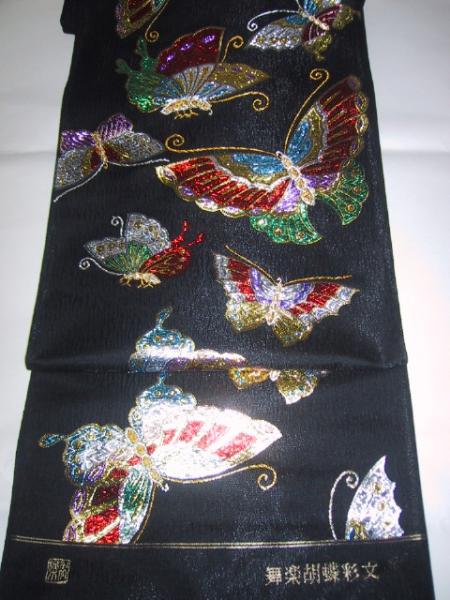 ((十三参りにいかが!)) きら綺羅と華やかな柄の六通帯(表:黒地)を出品いたします。若向きの帯ですが、長さがS規格(通常より約10cm短い約422cm強)。新品、未仕立て品、絹100%金属糸等使用   細身だから気持ち短いほうがいいといわれる成人の方にも何とか使えるとは思います。