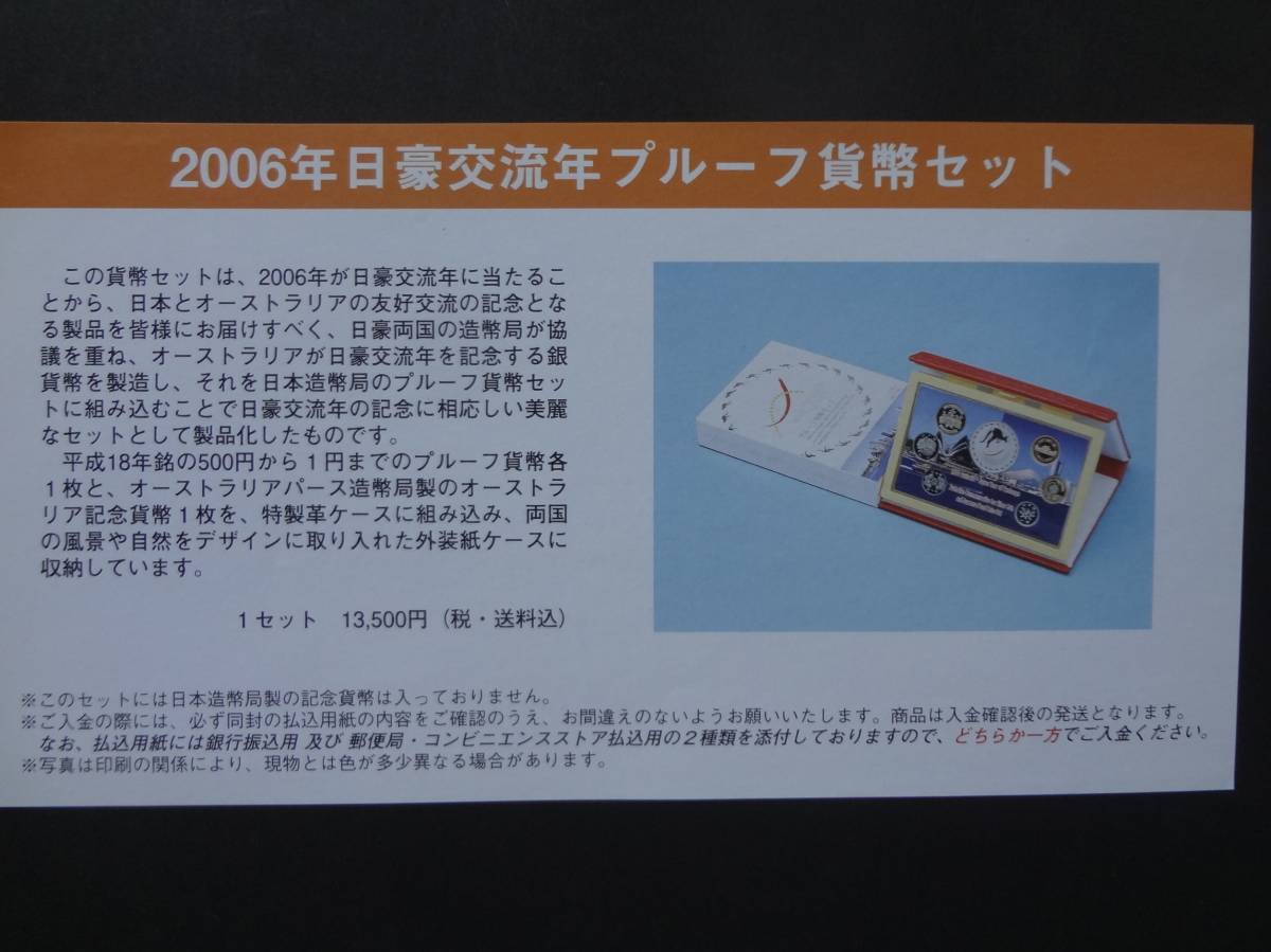 この貨幣セットは、2006年が日豪交流年に当たることから、日本とオーストラリアの友好交流の記念となる製品として、日豪両国の造幣局が協議を重ね、オーストラリアが日豪交流年を記念する銀貨幣を製造し、それを日本造幣局のプルーフ貨幣セットに組み込むことで日豪交流年の記念に相応しい美麗なセットとして製品化したものです。