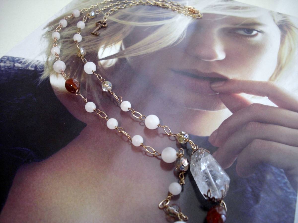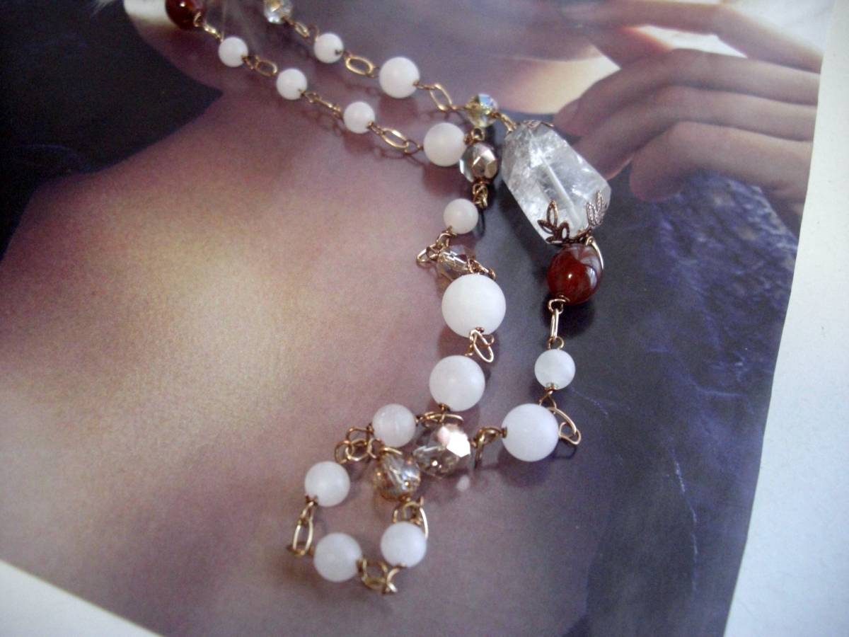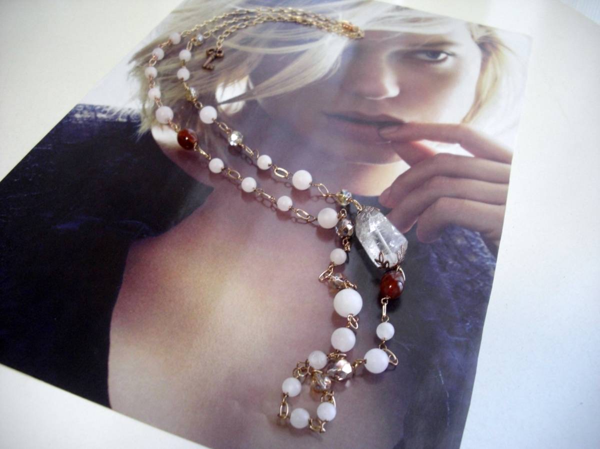 お気に入りを+して・・シリーズです♪神秘的なローズクォーツとルチルクォーツのネックレスです♪やさしい表情のフロスト加工のローズクォーツ、座金でおめかししたルチルクォーツやアンティークバンデットアゲート、チェコビーズをピンクゴールドのチェーンで繋いでロマンチックなネックレスです♪ローズクォーツは6ミリ、8ミリ、10ミリの丸玉です♪ルチルクォーツは28×17ミリ位のラフカットです♪深い赤のバンデットアゲートは8×10ミリ位のナツメ型です♪長さは全長105センチ位で調節自由です♪2連にされても素敵です♪お揃いのブレスレットやピアスも出品しています♪シンプルで飽きのこないいつまでも着けられるデザインを考えて作りました!ハンドメイドをご理解頂い てノークレーム、ノーリ ターンでお願いします