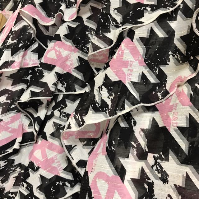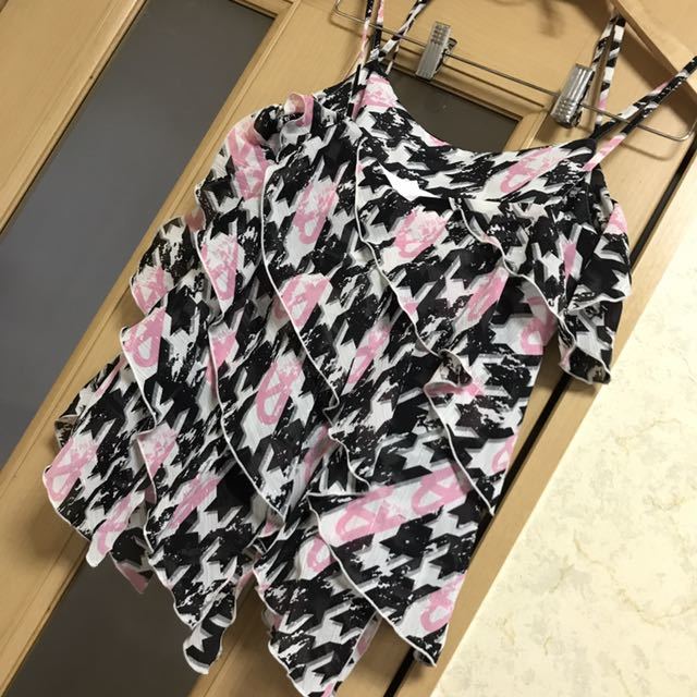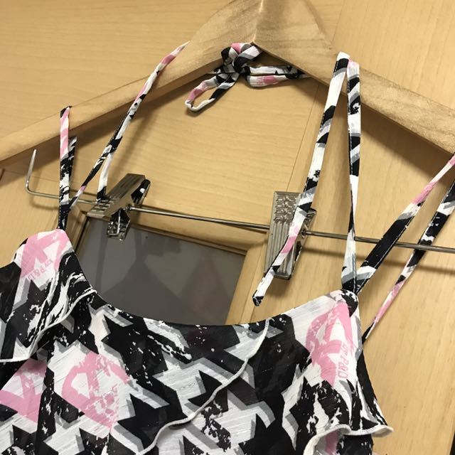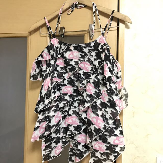 ◆ピンクのロゴにラメスリット糸使いの4段フリルシフォンがヒラヒラ綺麗♪ホルターリボン付♪デニムと合わせてカジュアルにも,またフォーマルやスーツジャケットのインにも素敵です