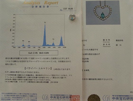 *中央宝石研究所の分析付き鑑別書が付いていますので価値があります。鑑別書には、【透明緑青色】と記載されています。