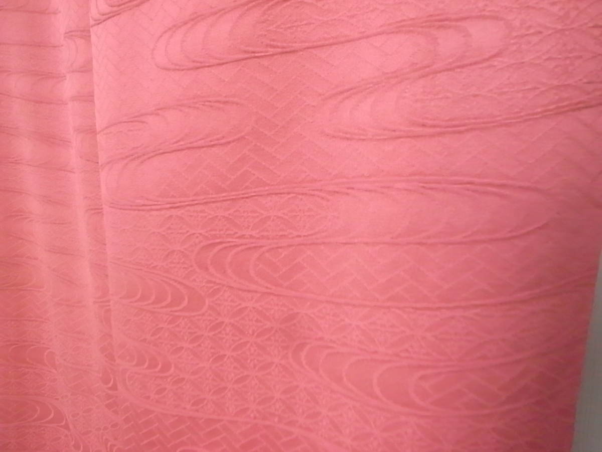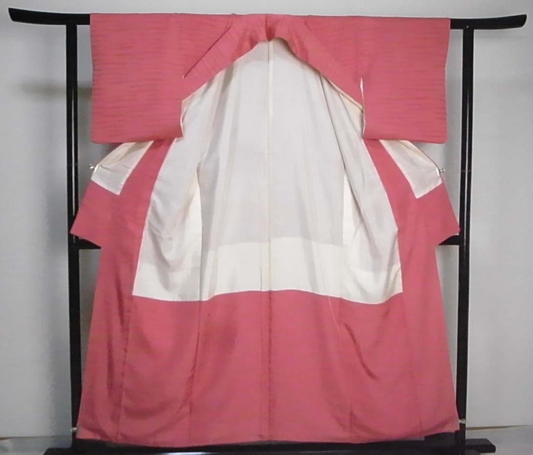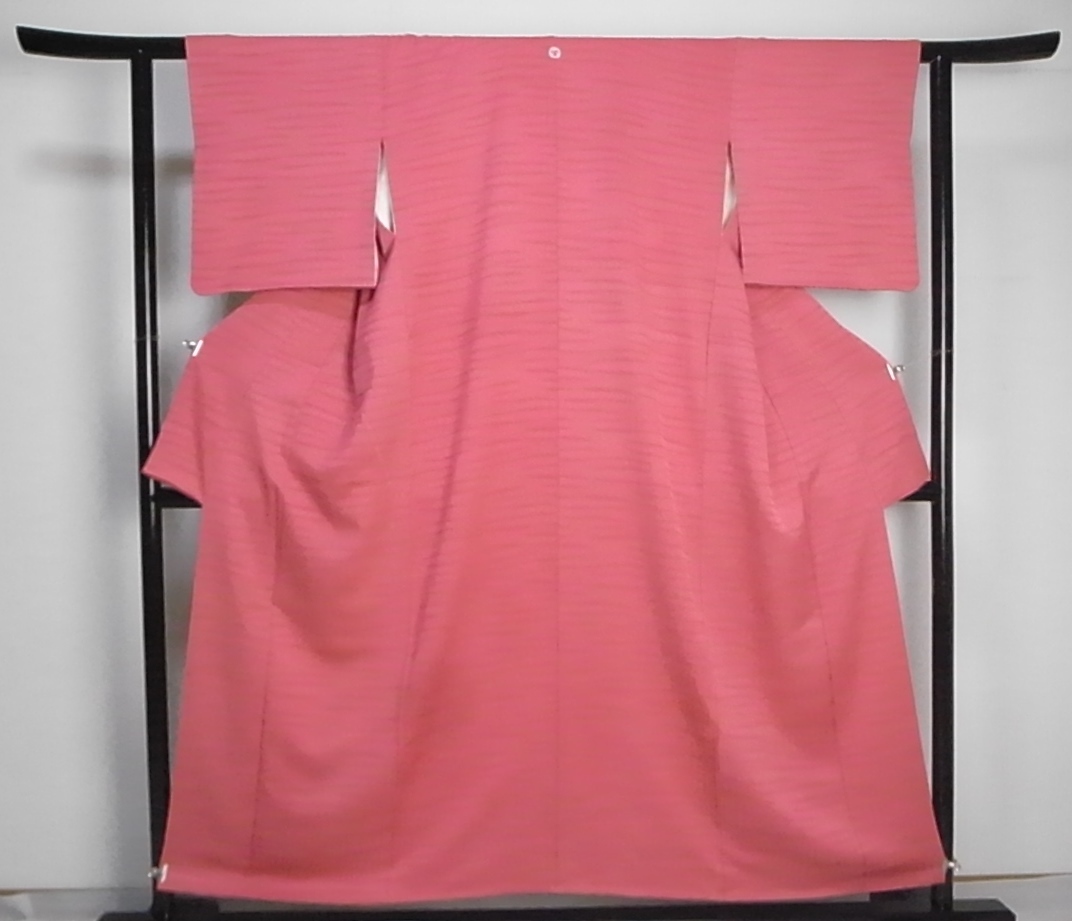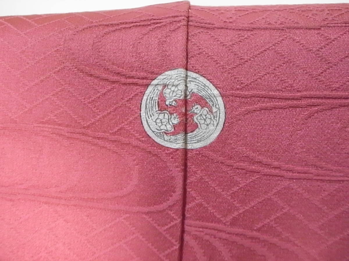 【着物のちさと屋】C35 着物・色無地 袷 美品 正絹紋意匠織ちりめん ローズ色地・生地柄生かし横流七宝柄模様 一つ紋入