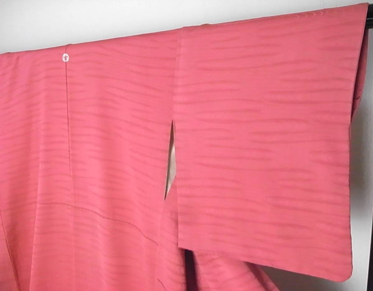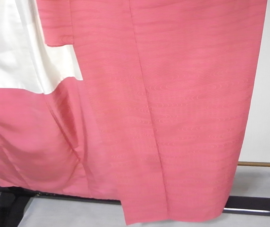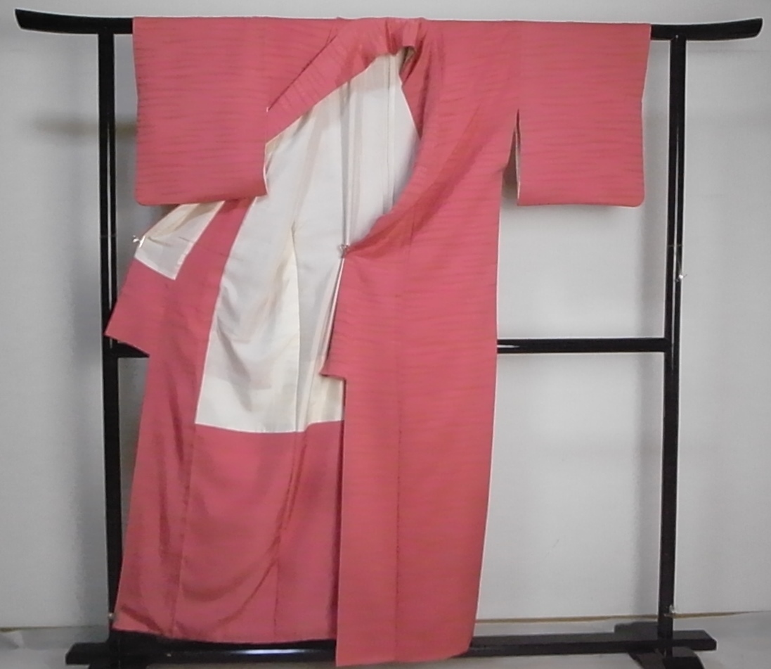 【着物のちさと屋】C35 着物・色無地 袷 美品 正絹紋意匠織ちりめん ローズ色地・生地柄生かし横流七宝柄模様 一つ紋入