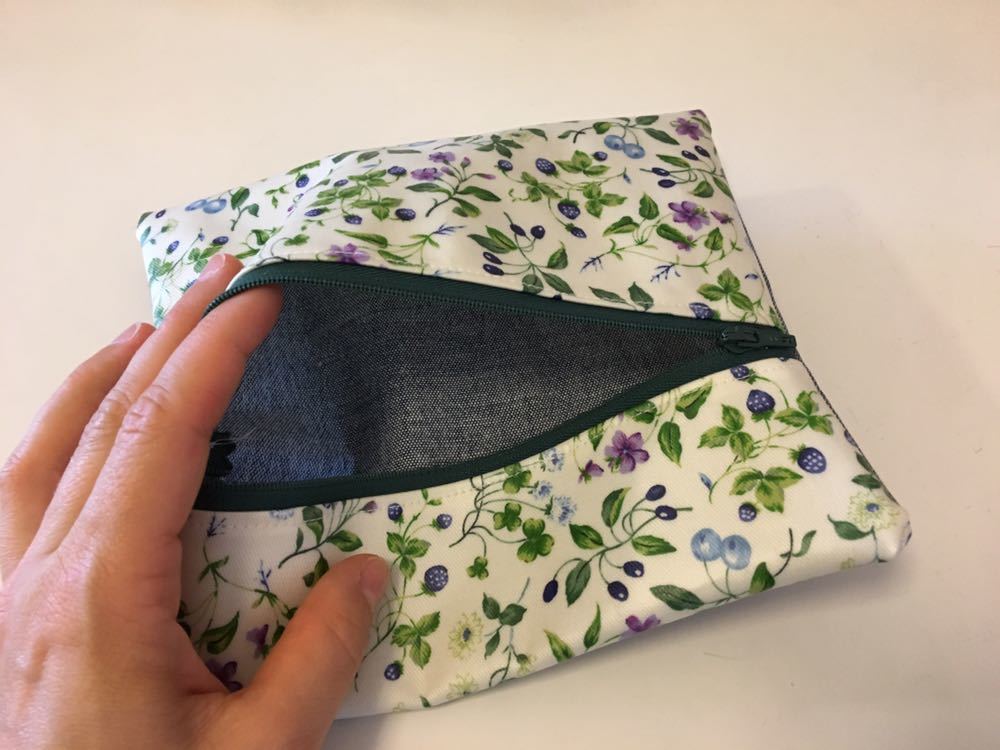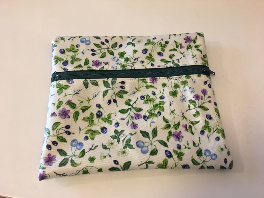 ベリー*花柄のラミネート生地とデニムのラミネート生地でポーチを作りました。