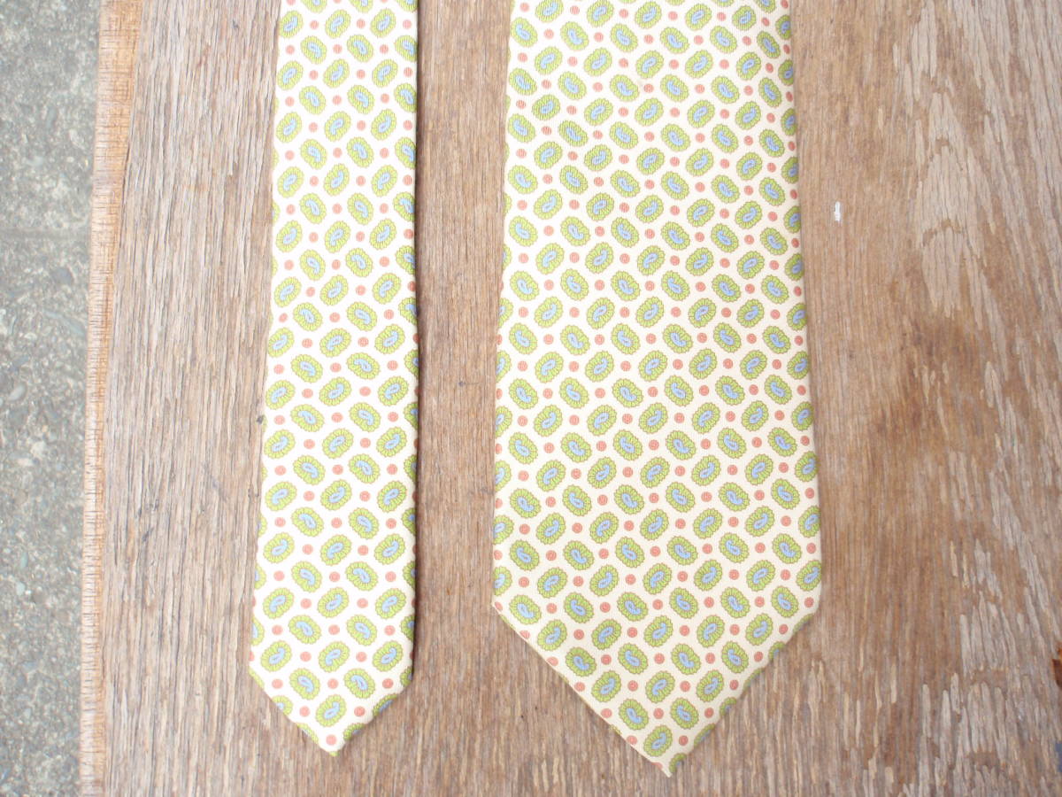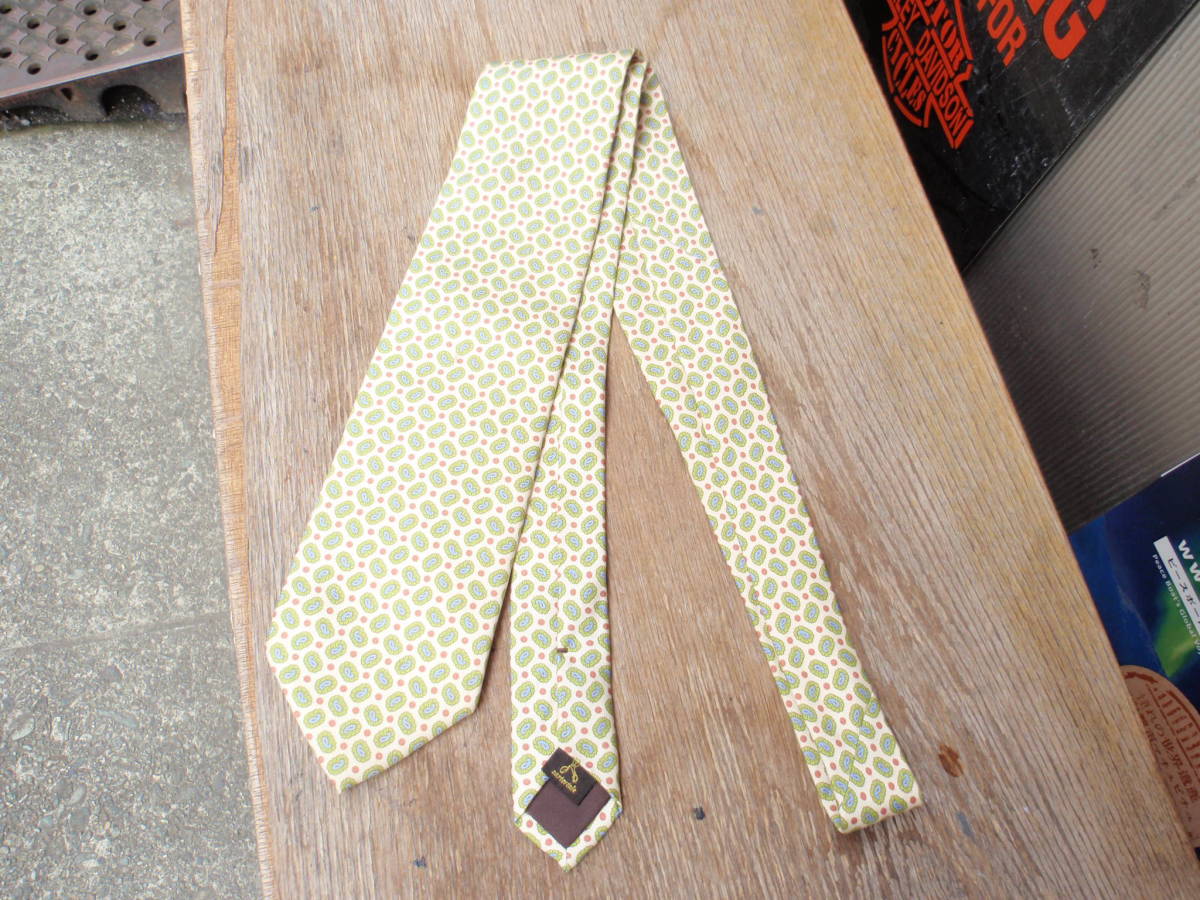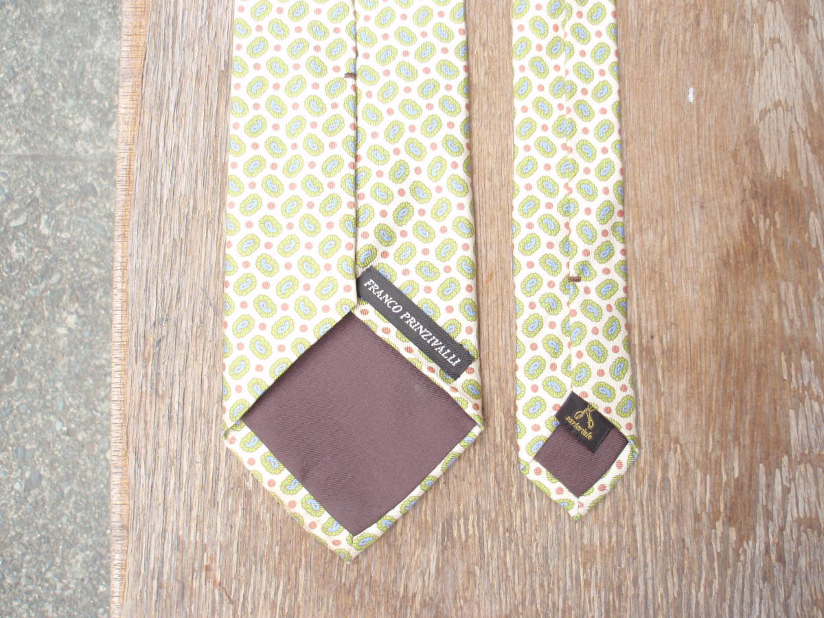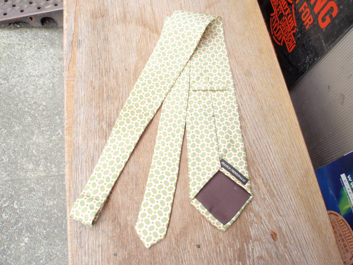 中古品ですが、ほとんど使って無かったので目立った汚れや傷は無く状態は良いです。日本製フランコプリンツィバァリーのシルクネクタイになります。全体的にベージュベースに緑ドットのような模様になります。サイズは全長148センチ、最大幅8.5センチ位です。正規品。