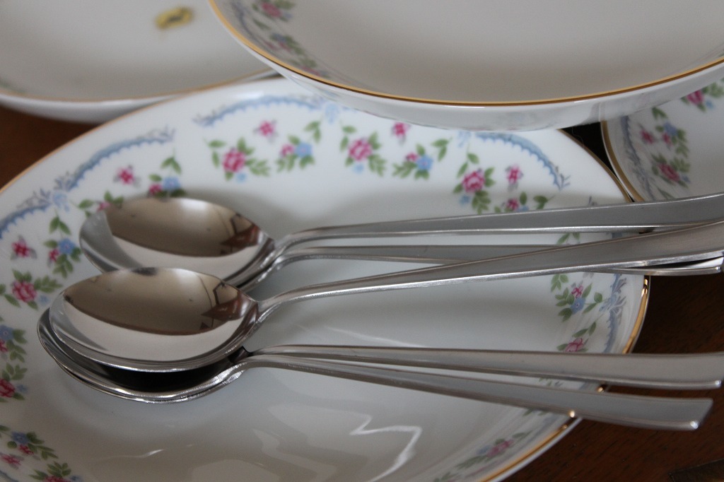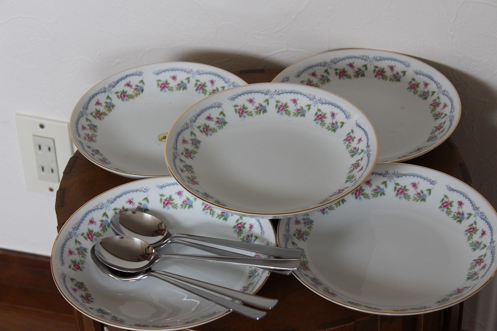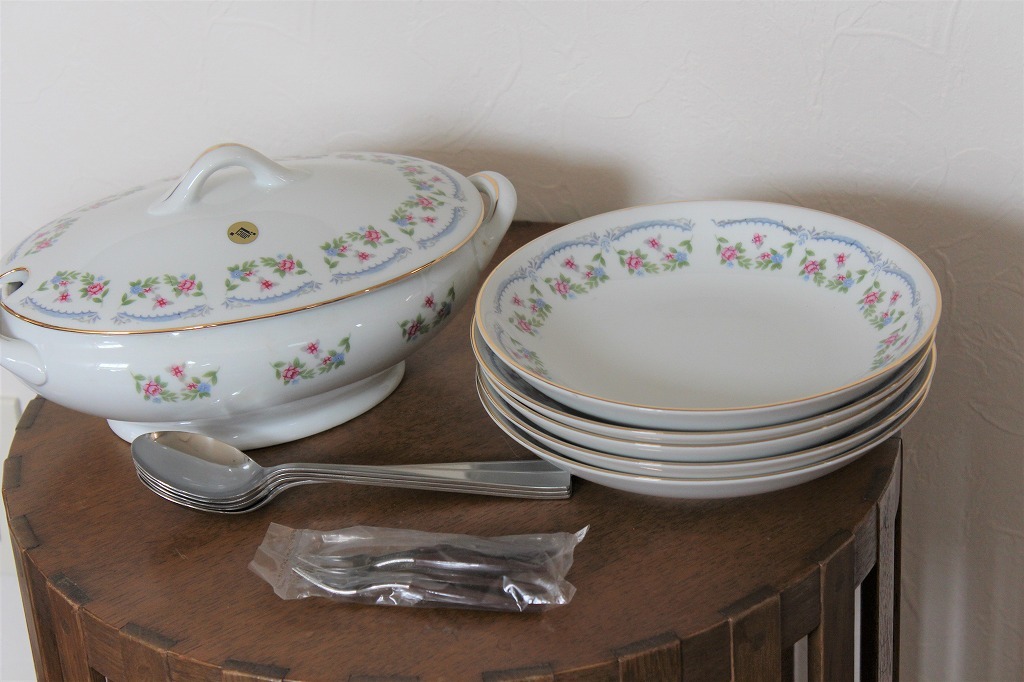 田舎の倉庫整理品 SONEチャイナ カレーセット 未使用長期保管品 **セット内容** ●カレーポット ●お皿/5 ●スプーン/5 ●姫フォーク/5 size/ カレーポット/16cm×26cm×13cm お皿/径19.5cm×3.3cm 可愛いレトロな花柄です。お探しの方に。 長期保管による汚れ(洗えばとれます)などございます。 画像判断となります。神経質な方はご遠慮ください |