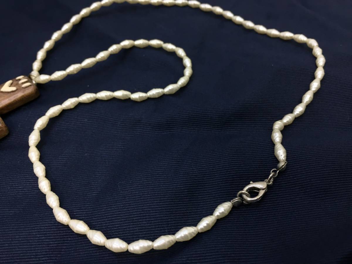 素材:ネックレスはパール系(おそらくイミテーションパールだと思います。)・ペンダント部分は木製のような質感。