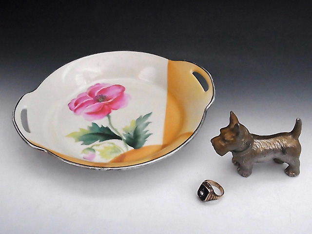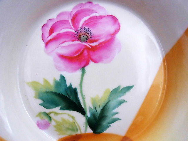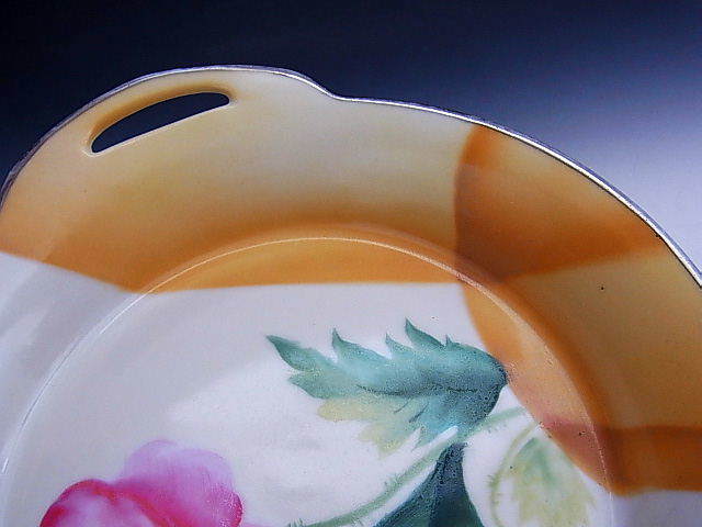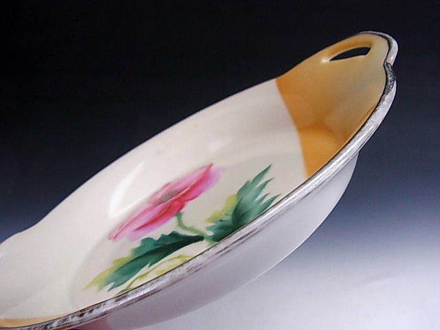 シャープな印象を与える銀彩縁に濃淡のついた黄色で直線と曲線を組み合わせたアールデコ意匠のオールドノリタケ作品です。 見込にはピンク色のポピーが描かれています。 状態は銀彩縁に経年による擦れがある以外ほぼ完全美品です。 大きさはハンドル部分を含めた直径が19.3cm、縁からの高さが3cm あります。 年代は大正中期の米国向け作品です。 送料は2800円頂きます。 お支払いはYahoo!かんたん決済、または銀行振込みでお願いします。 ご入金確認後支払2日以内にアメリカより航空便でお送りいたします。 発送後通常4~10日でお届けいたします。 複数品落札の場合は送料をまとめて計算させて頂きますのでお得になります。 私共は経済産業省の定める特定商取引法を順守しております。 当方の所在地住所等は出品者の自己紹介情報欄をご覧ください。 ご質問等ございましたらお気軽にお問い合わせください。   他にもオールドノリタケを中心に沢山出品しておりますのでここをクリックしてご覧ください。