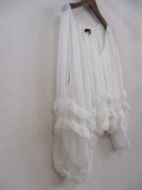 商品紹介 | ふんわりとした形とボリュームのある袖がオシャレな7分袖ブラウスです。 色は白、表地はシフォン素材で透け感があります。 (袖は裏地がなく透けています。) 袖口と裾はゴムでギャザーが入っています。 肩から二の腕にかけて開いたデザインで 2か所、ボタンで留める形になっています。 《素材》 表地・裏地:ポリエステル100% |