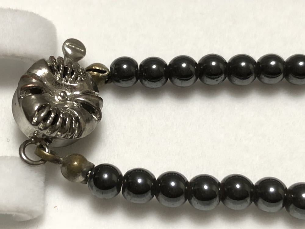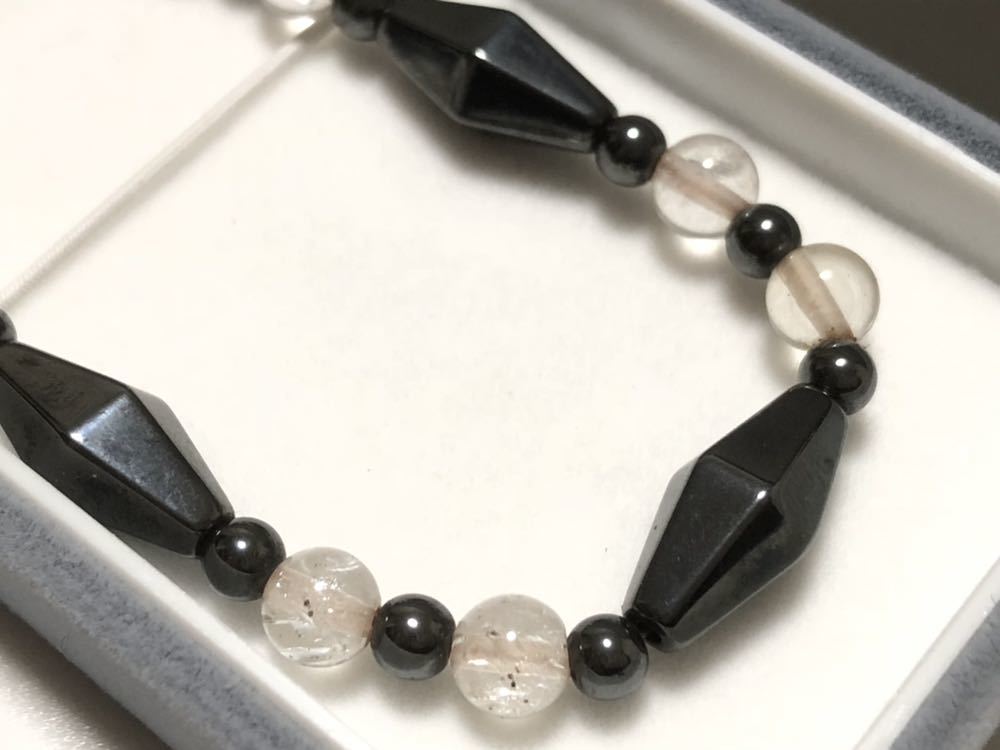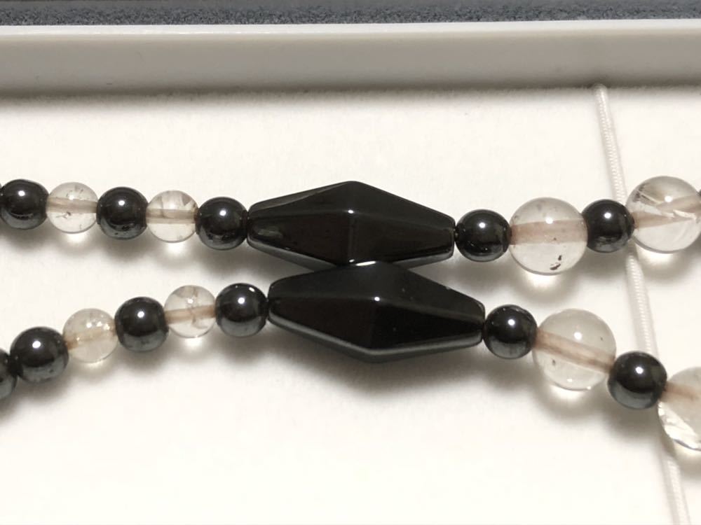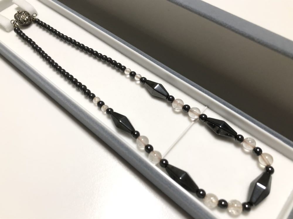 ヘマタイト、本水晶を使用した、デザイン磁気ネックレスです。一番大きなヘマタイトのパーツに磁石が入っています。くすみ、金属面の劣化があります。