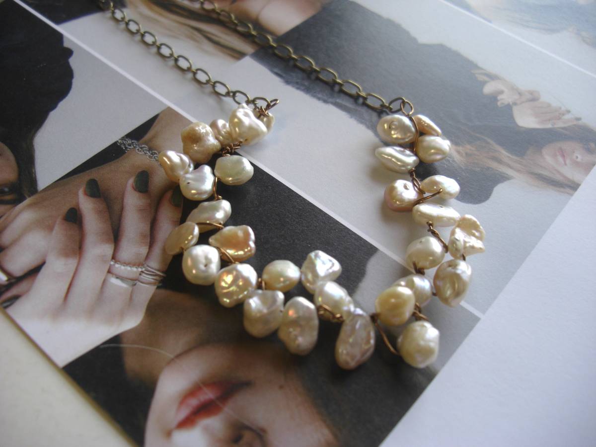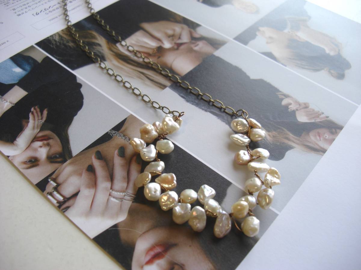 モンローの夢・・シリーズです♪芥子パールを繋いで・・ふんわりやさしいベージュ・ピンクの芥子パールをワイヤーでデザインしてロマンチックなネックレスです♪8ミリから 9ミリ位の芥子パールを花びらのようにワイヤーで紡いでいます♪長さは全長70センチ位で調節自由です♪短くチョーカー風にされても素敵です♪お揃いのブ レスレッ トやピアスも出品しています♪♪シンプルで飽きのこないいつまでも着けられるデザインを考えて作りました!ハンドメイドをご理解頂いてノークレーム、ノー リターンでお願いします
