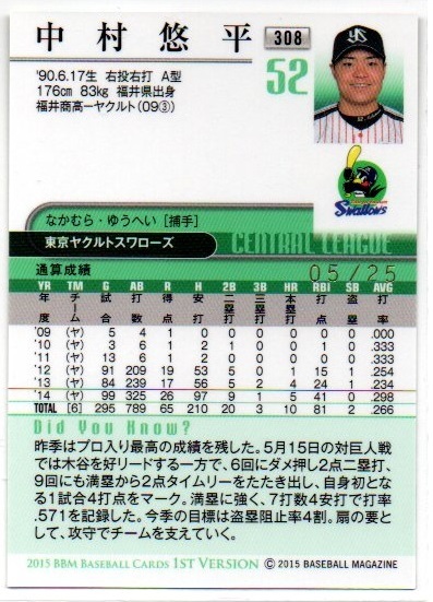 【中村悠平(東京ヤクルトスワローズ)】2015 BBM 1st Version 赤箔サインパラレルカード [05/25]