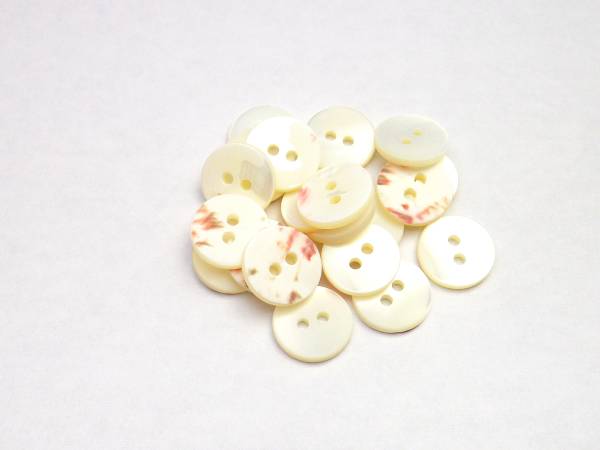 | ★商品説明★ | 非常に使いやすい まっ平らな型の2穴の高瀬貝ボタンです。 珍しいマットな艶消しにしました。 艶消しにしたことで、高級感も増し、貝なのに温かさも出ています。 9mm. 10mm. 11.5mm. 13mm. 15mm のサイズがあります。 「貝 ボタン まっ平ら」 で検索してください。 洋服のボタン変え、趣味の手芸にと、大活躍な形です。 「貝ボタン」の原材料(原貝)のなかで最もポピュラーなのが「高瀬貝」です。 主にワイシャツやブラウスのボタンに使われている巻貝で、 ボタン裏側にピンクやブルーの模様があるのが特徴です。 | ||