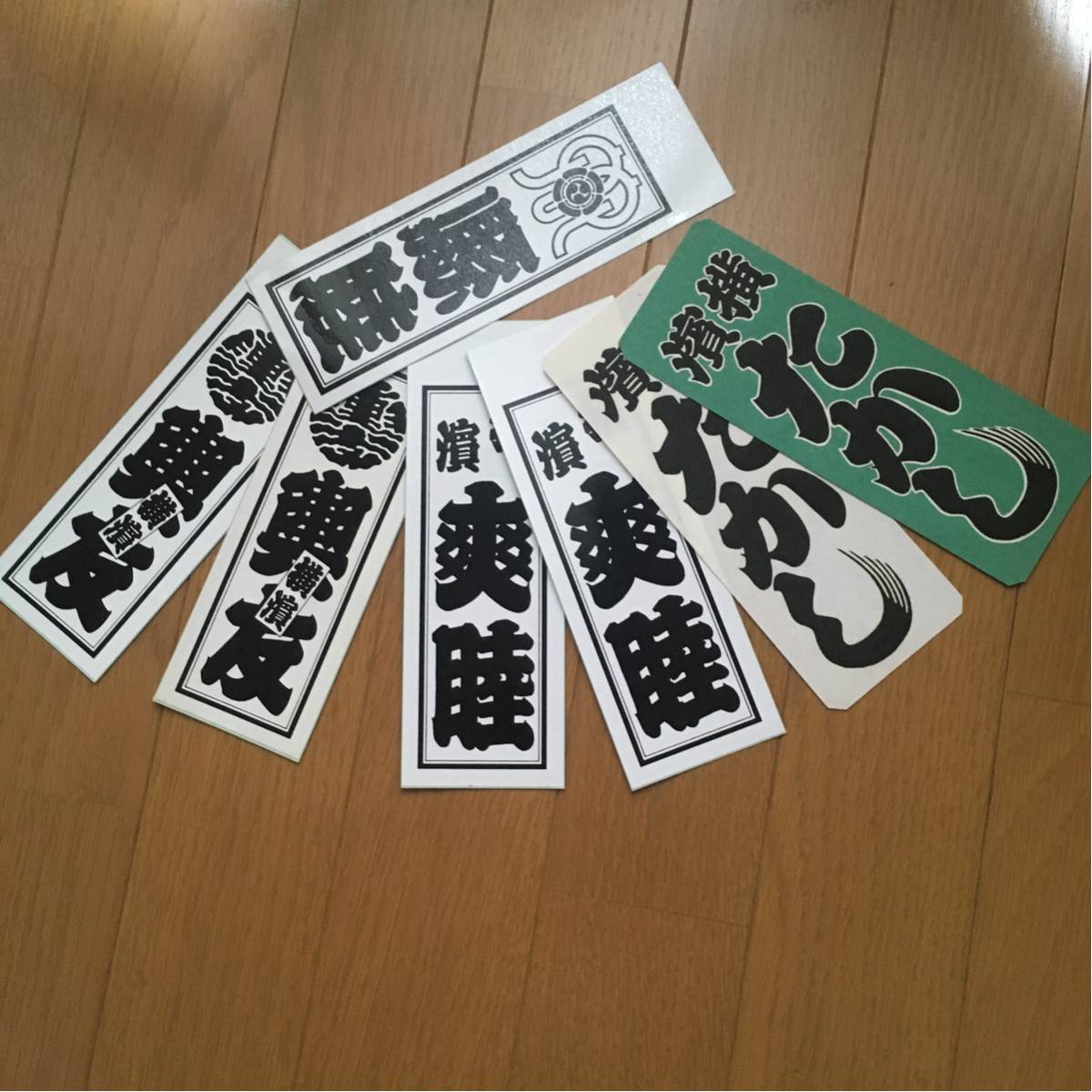 【横濱 たかし】の緑&白2枚は、ステッカーでなく和紙になります。此処に訂正させて頂きます。大きさですが、【縣睦】が170㎜×59㎜・【爽睦】2枚が174㎜×59㎜・【興睦】2枚が173㎜×59㎜、【たかし】2枚が170㎜×63㎜になります。(1or2㎜の誤差はご容赦下さい)ステッカー5枚に関しましてはラミネート加工ですので雨に濡れても大丈夫です。