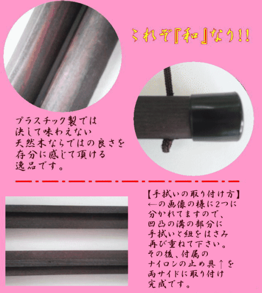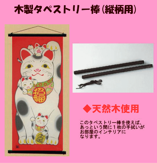 天然木を使用した手拭い専用のタペストリー(掛け軸)棒です。 手拭い一枚をそのまま飾る事ができ、 一枚の柄絵をあます所なく味わえます。 又、防腐効果がございます『柿渋』を使用しております。 来客の際や場と空気を造りだすインテリアとして是非お勧めです。 四季折々の手拭いを飾ってみてはいかがでしょうか? 1枚の手拭いが素敵なアートに!!是非お試し下さい。 ★サイズ★ 長さ約55cm×直径2cm ★素材★ 天然木 ★付属品★ 紐・取付カバー(ナイロン)付き 縦柄用(小サイズ)及び横柄用のタペストリー棒も販売中です。 |