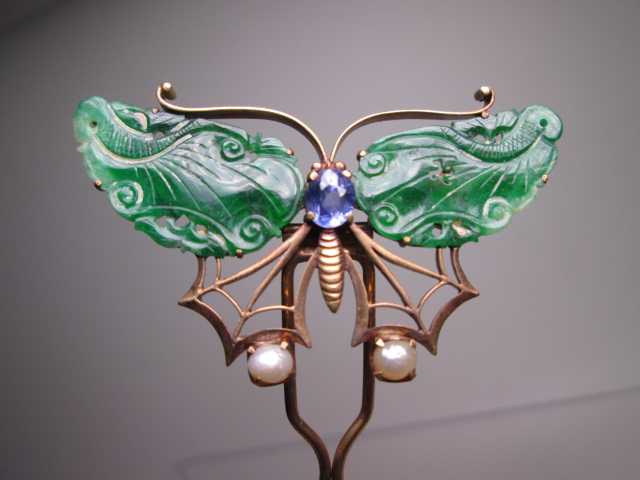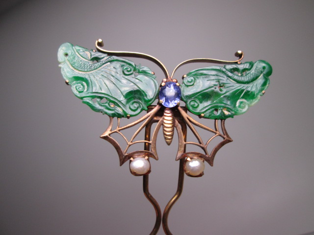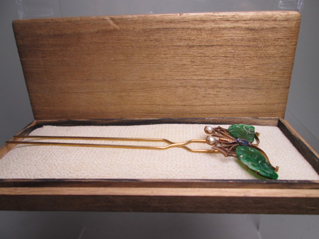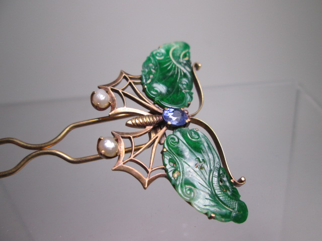 江月】アンティーク・K18 本翡翠 本真珠飾り蝶のかんざし 10g 木箱付