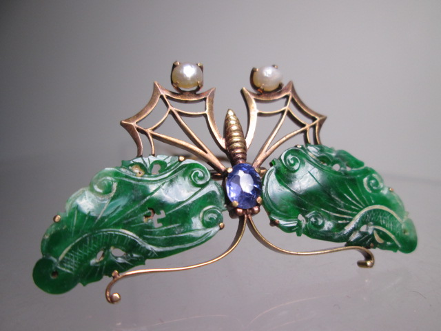 上質のとても美しい本翡翠の蝶の羽です。中央の淡い薄紫色の石はアメジストです。
