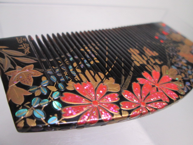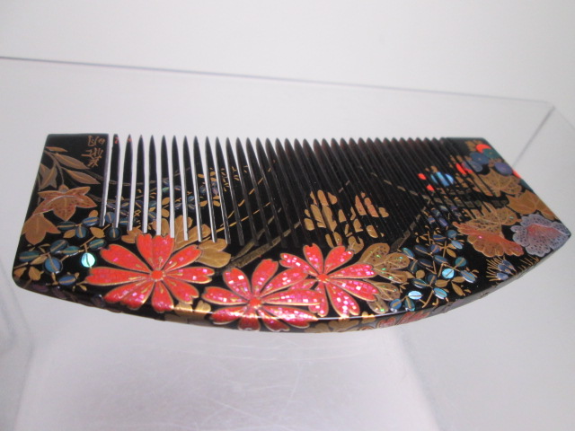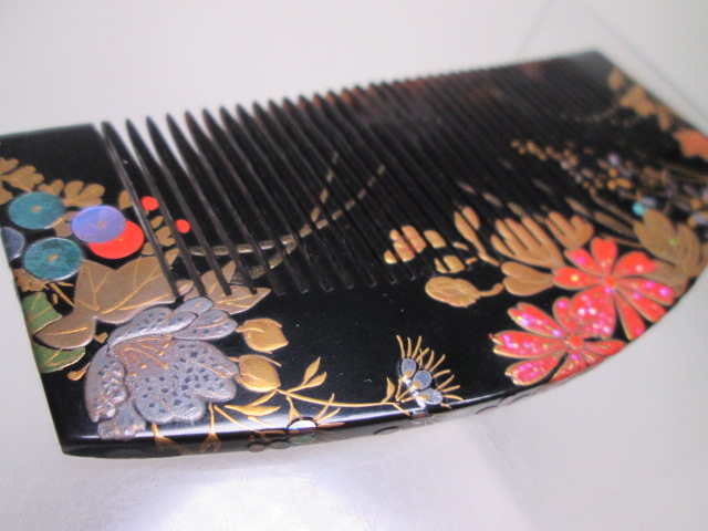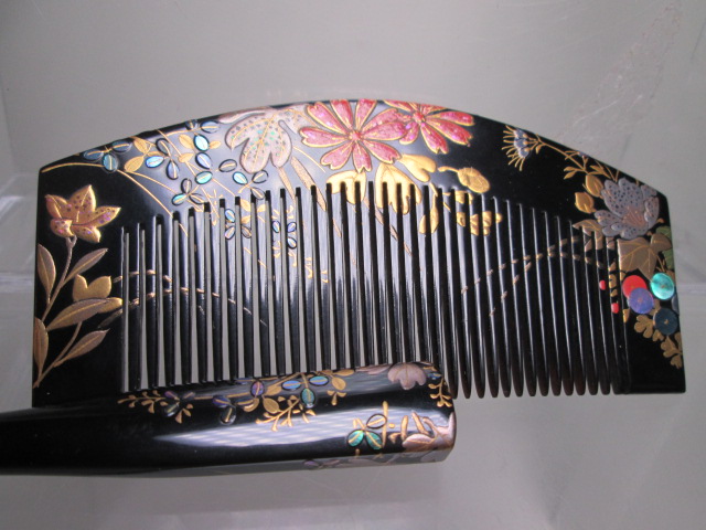 菊花、萩、リンドウ等の花の螺鈿入り金蒔絵です。とても華やかで美しい櫛笄のセットです。虫食いは無く綺麗です。菊や鼈甲店の共ケース付です。