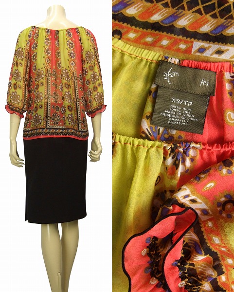 H 新品同様★fei★上級シルク(絹)100%生地*可憐スモックブラウス*XS表記★11~13号*L~XL(2L)*40~42相当