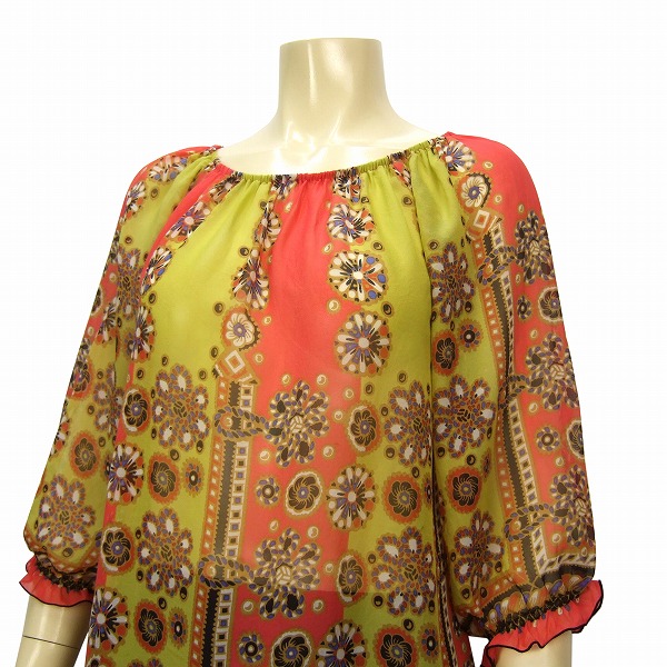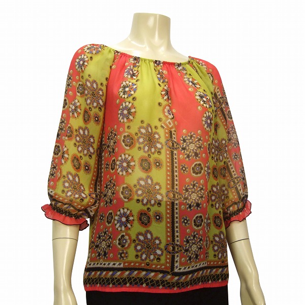 **・゜ラグジュアリーな上質シルクシフォンブラウスです。可愛い袖裾フリル(ゴム入)×透け感のある艶やかなシルク(絹)100%生地に色鮮やかなモダンデザイン柄(シャルトルーズイエロー系×淡いシグナルレッド系)♪とても柔らかな上質5分袖スモックブラウスです。*:.。(ネックラインと袖口はゴム入りデザインです。)