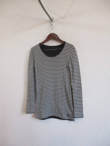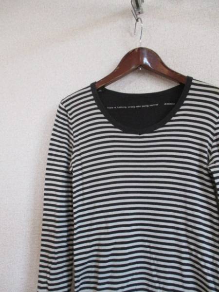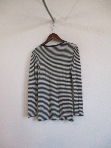 | 商品紹介 | 黒に近いこげ茶×ベージュのボーダー長袖カットソーです。 襟はVネックで、左裾にブランドロゴが刻印された丸いチャームが付いています。 《素材》 綿100% |