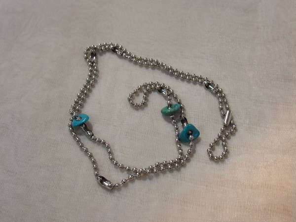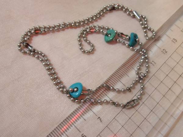 画像の、日本製の古いボールチェーン、キーホルター用のものを、つないで、なんと本ターコイズの大穴開けのものを3個、通してネックレス状に仕上げてみました♪