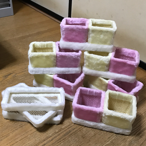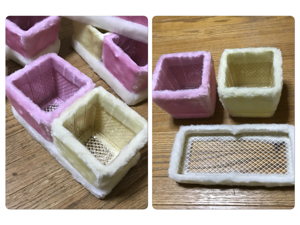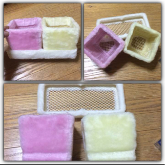 コンポート( 鉢入れ )は金属製の網にホワイト、イエロー、ピンクの3色のファーが付いている物です。ファーが濡れないように内部にはケースが付いています!