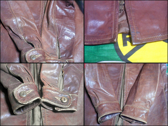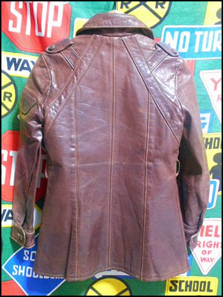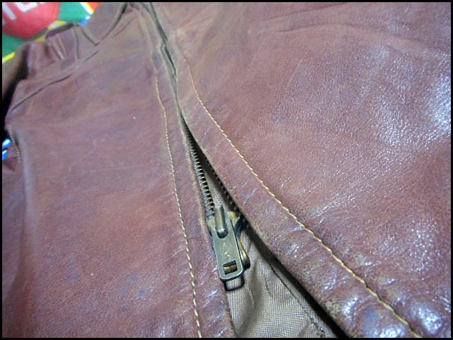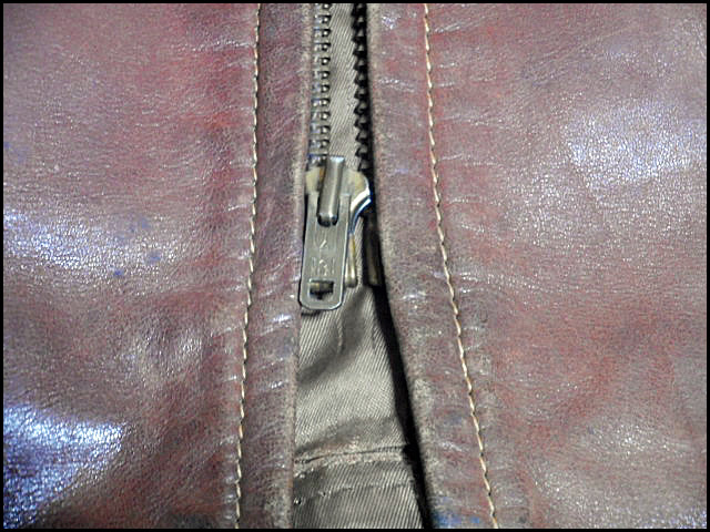 フロントジッパーは「TALON(タロン)」、EASE WEST(イーストウェスト)、OSHWAKON(オシュワコン)、Gandalf(ガンダルフ)と肩を並べるレザークラフト会トップクラスのブランドだけあって、体にまとわり着く様な革質、レザーのパターンやカティング、独特なデザインなどビンテージクラフトレザーらしいディティールもお楽しみ頂け、市場でもそれほど出現しないであろうこのデザインも魅力的なビンテージレザージャケットです。