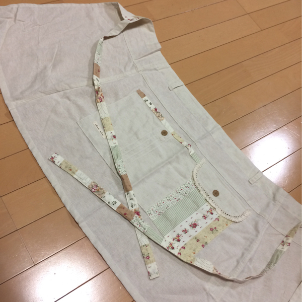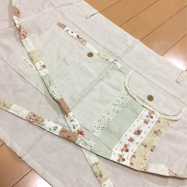 ◆カギ編レースや小花柄のポケットが可愛い♪腰紐にも小花柄♪ナチュラル可愛いエプロン