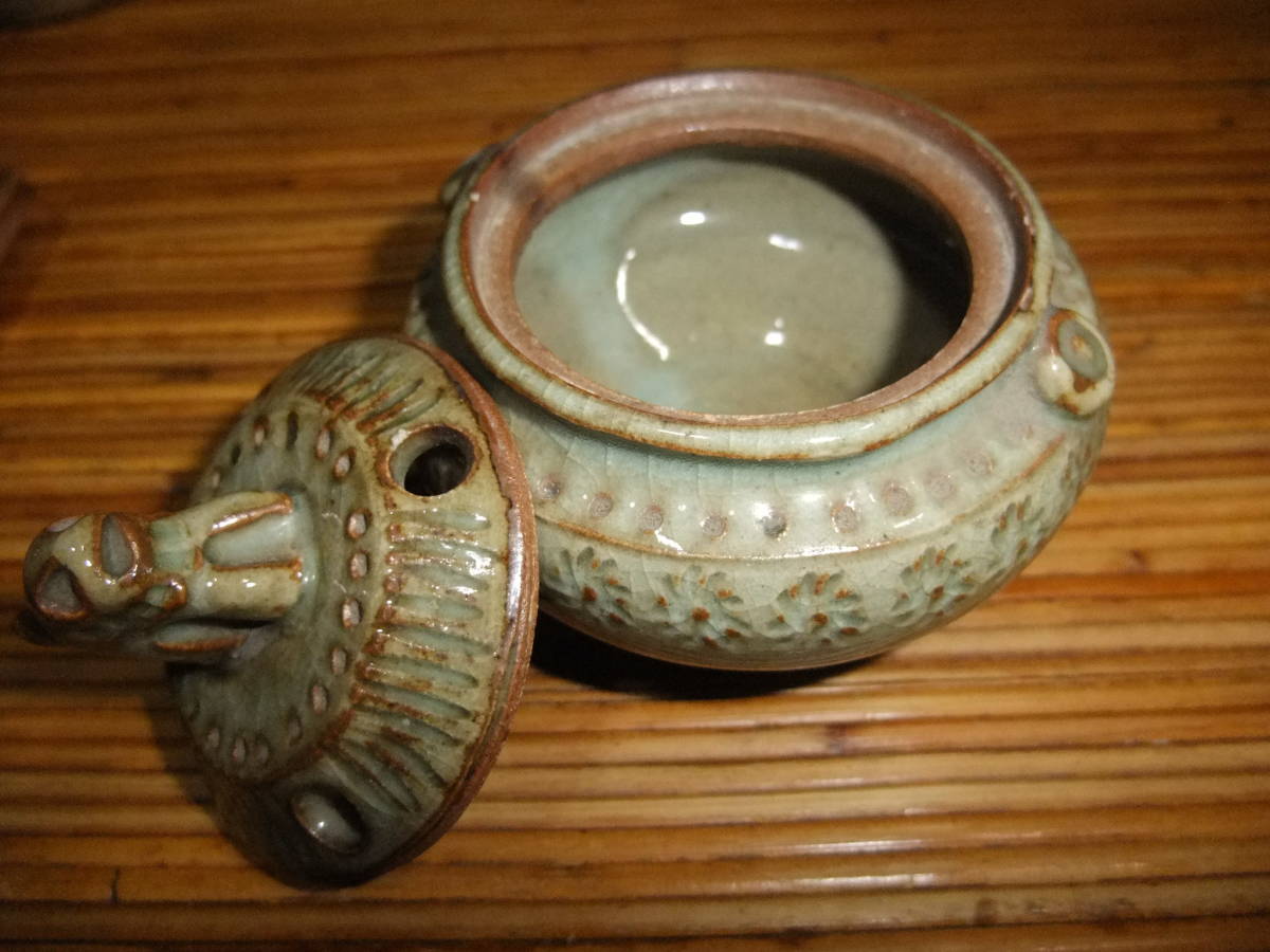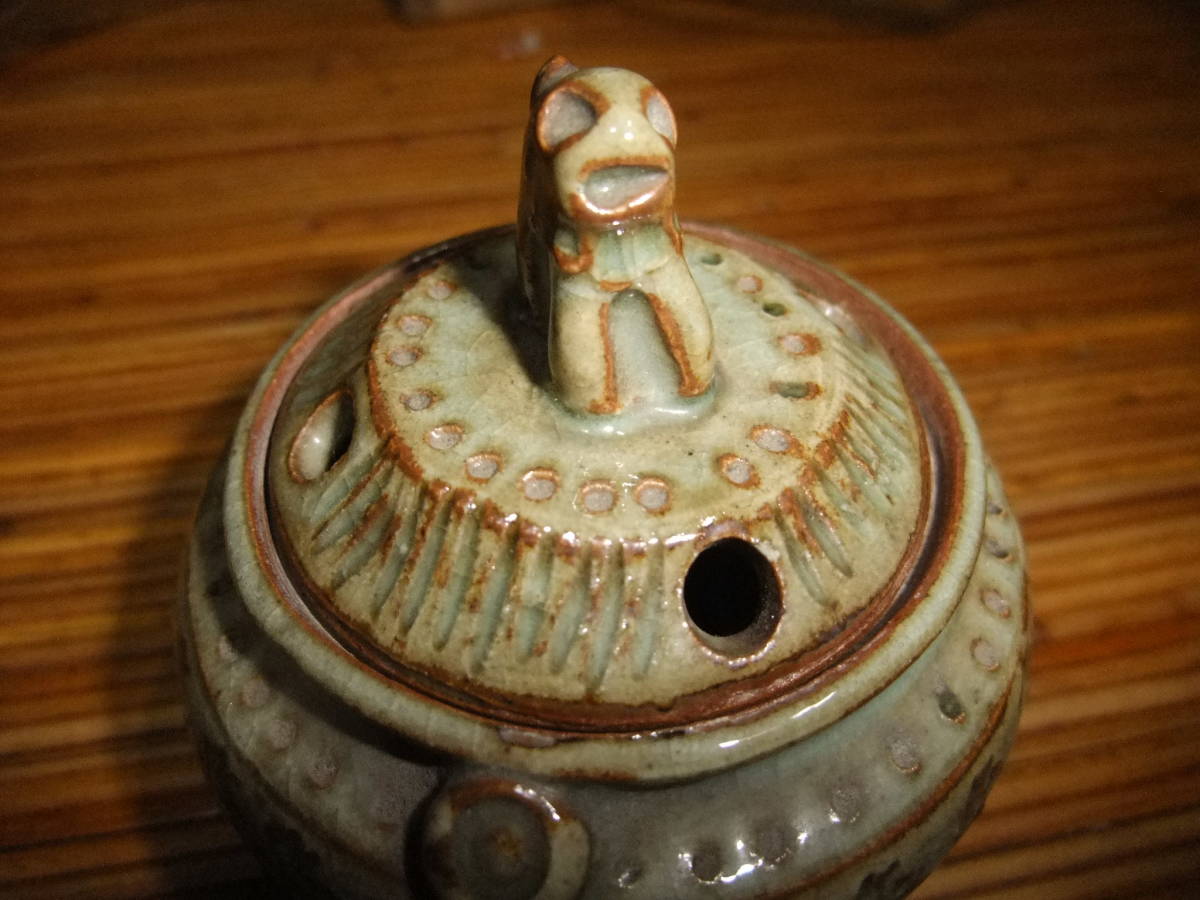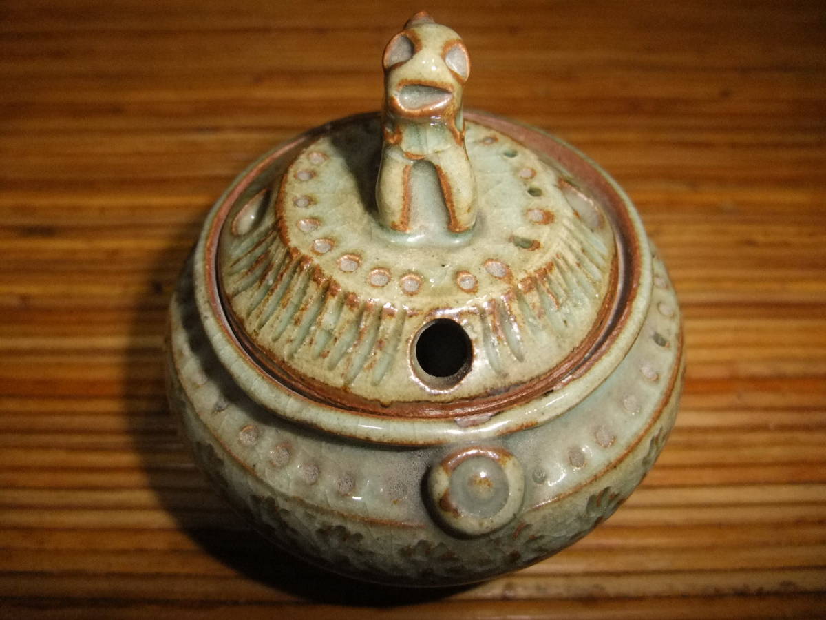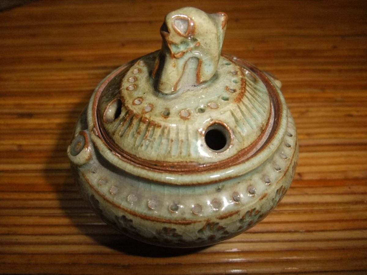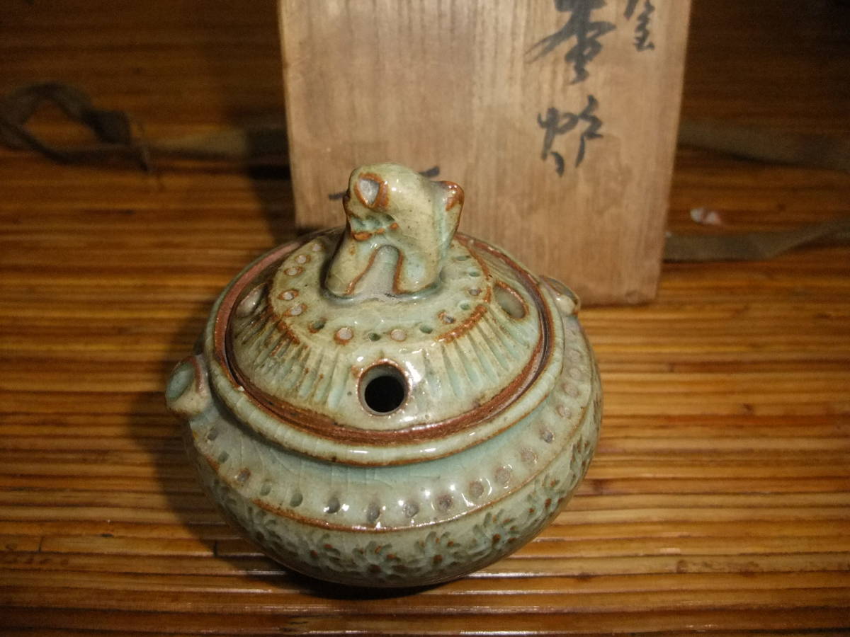 蓋に獅子(?)が付いています。底に北朗の銘が入っています(内島北朗)。箱には青?(字が読めません)香炉 北朗[喜]と墨書きがあります。箱に,灼け,汚れがあり時の経った感があります。