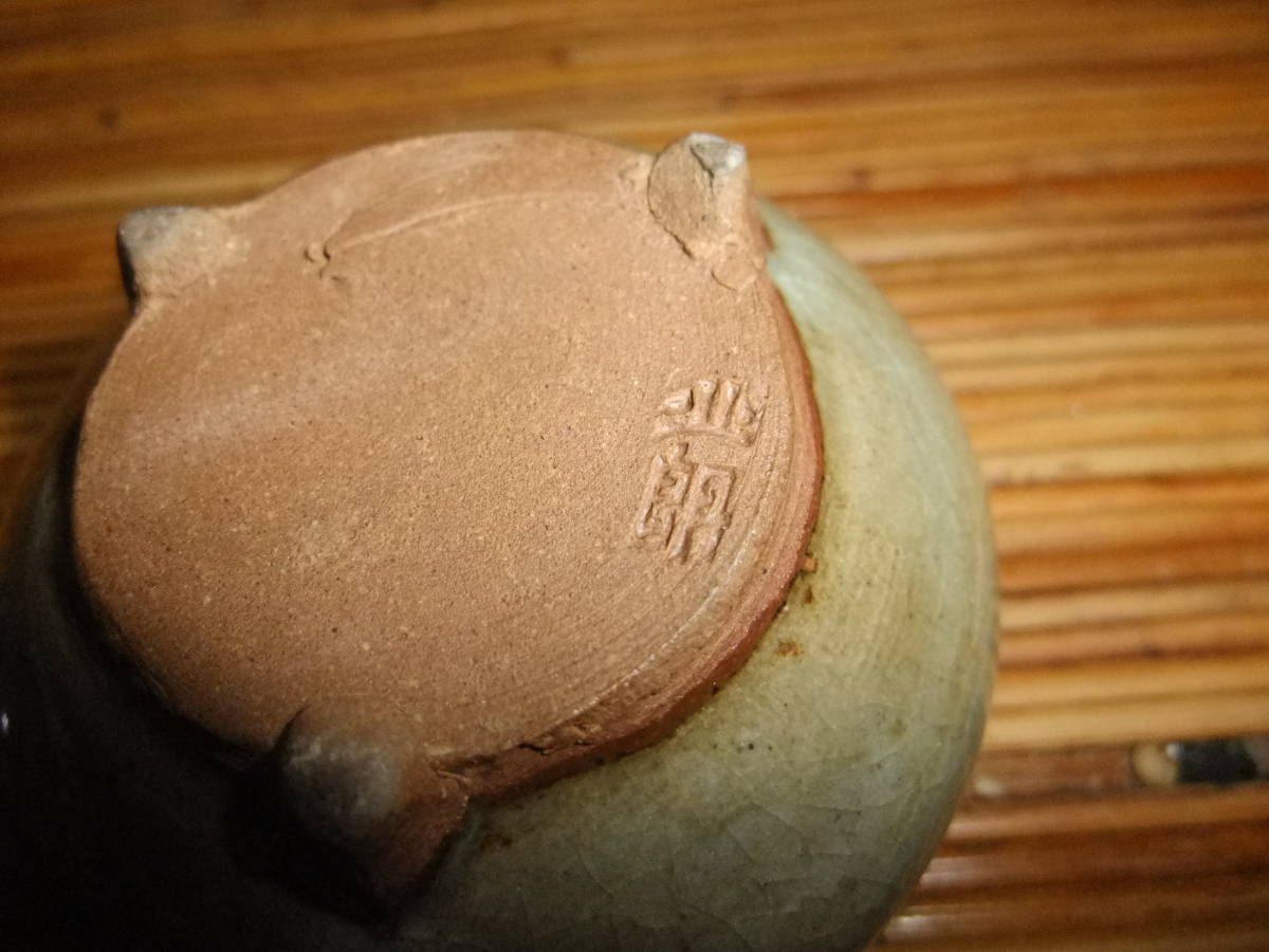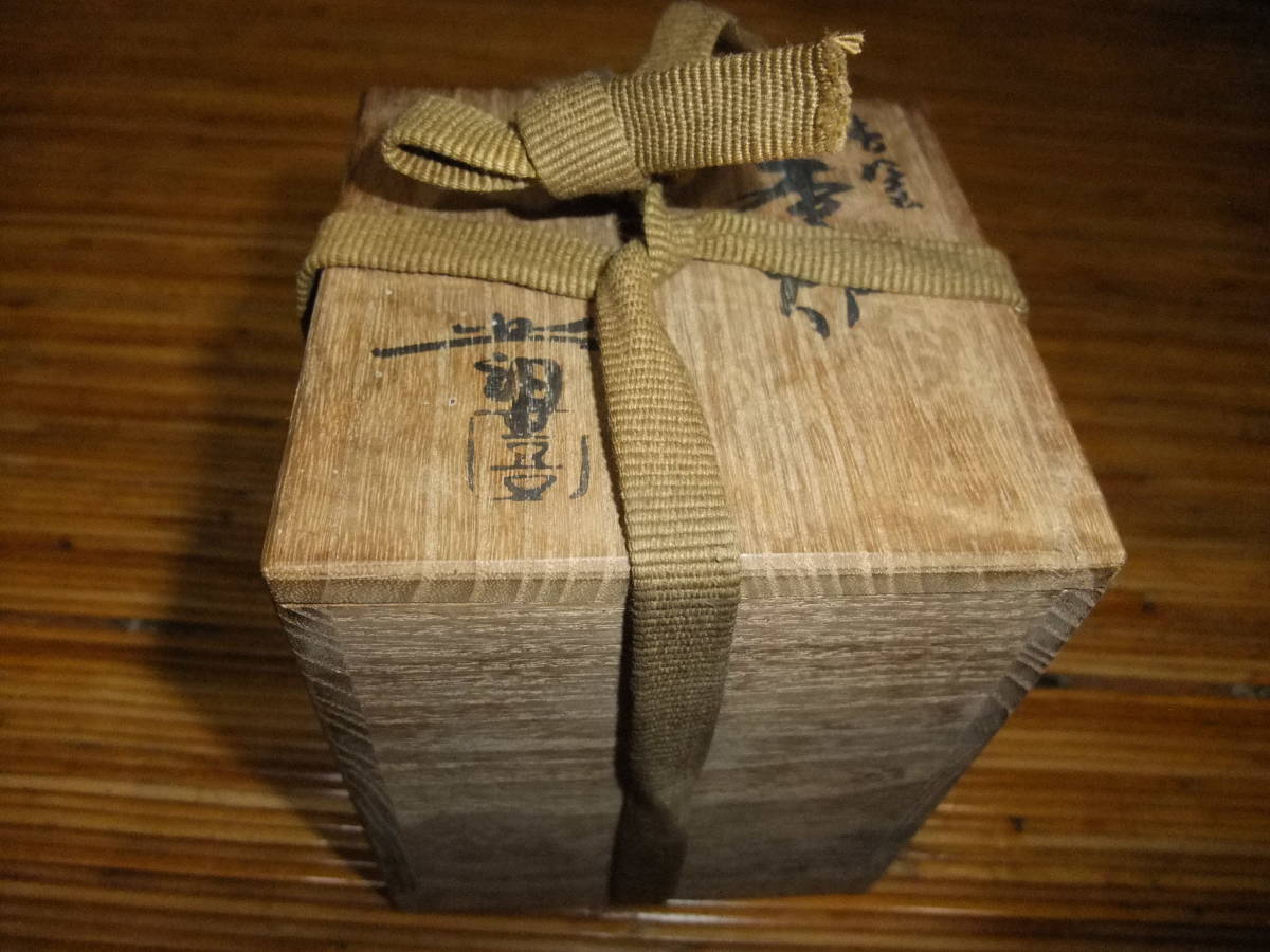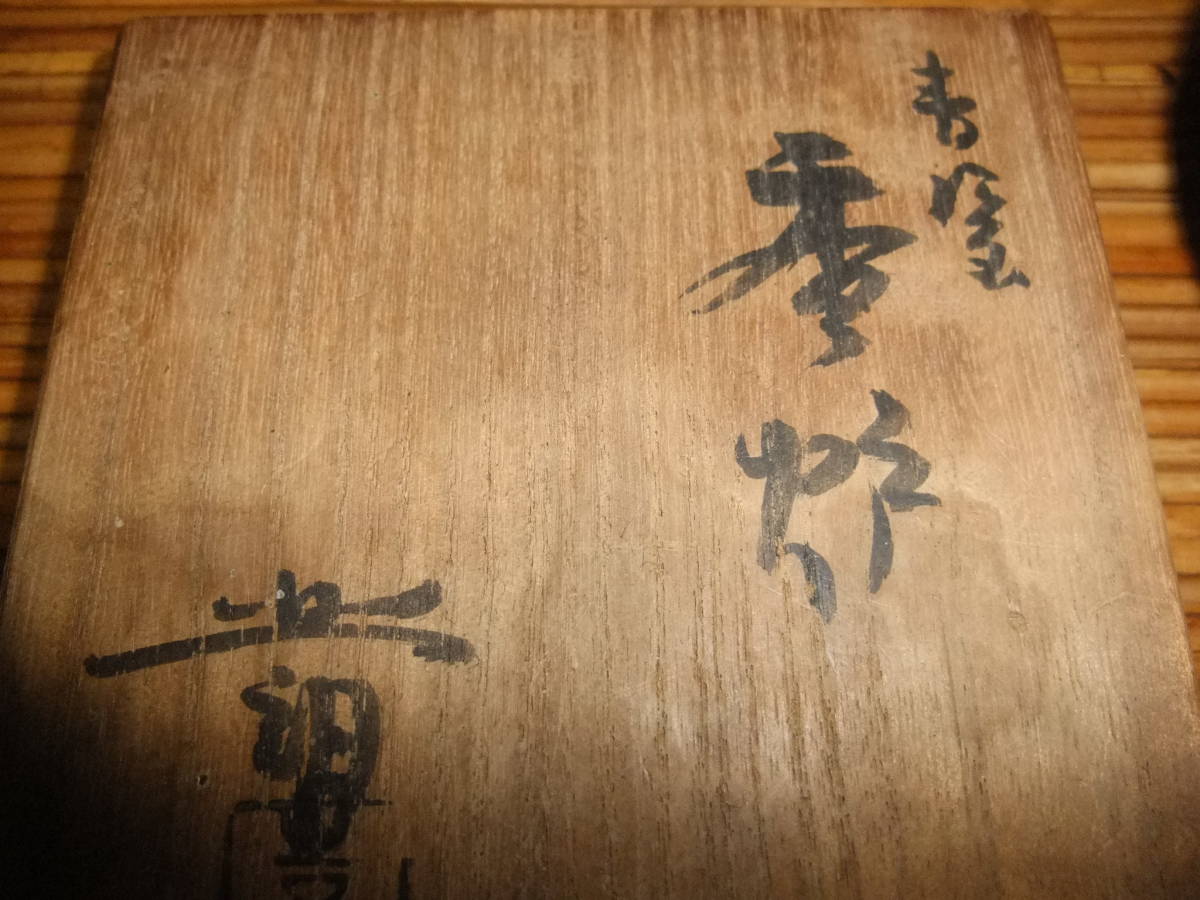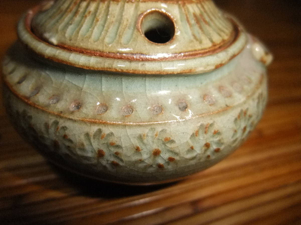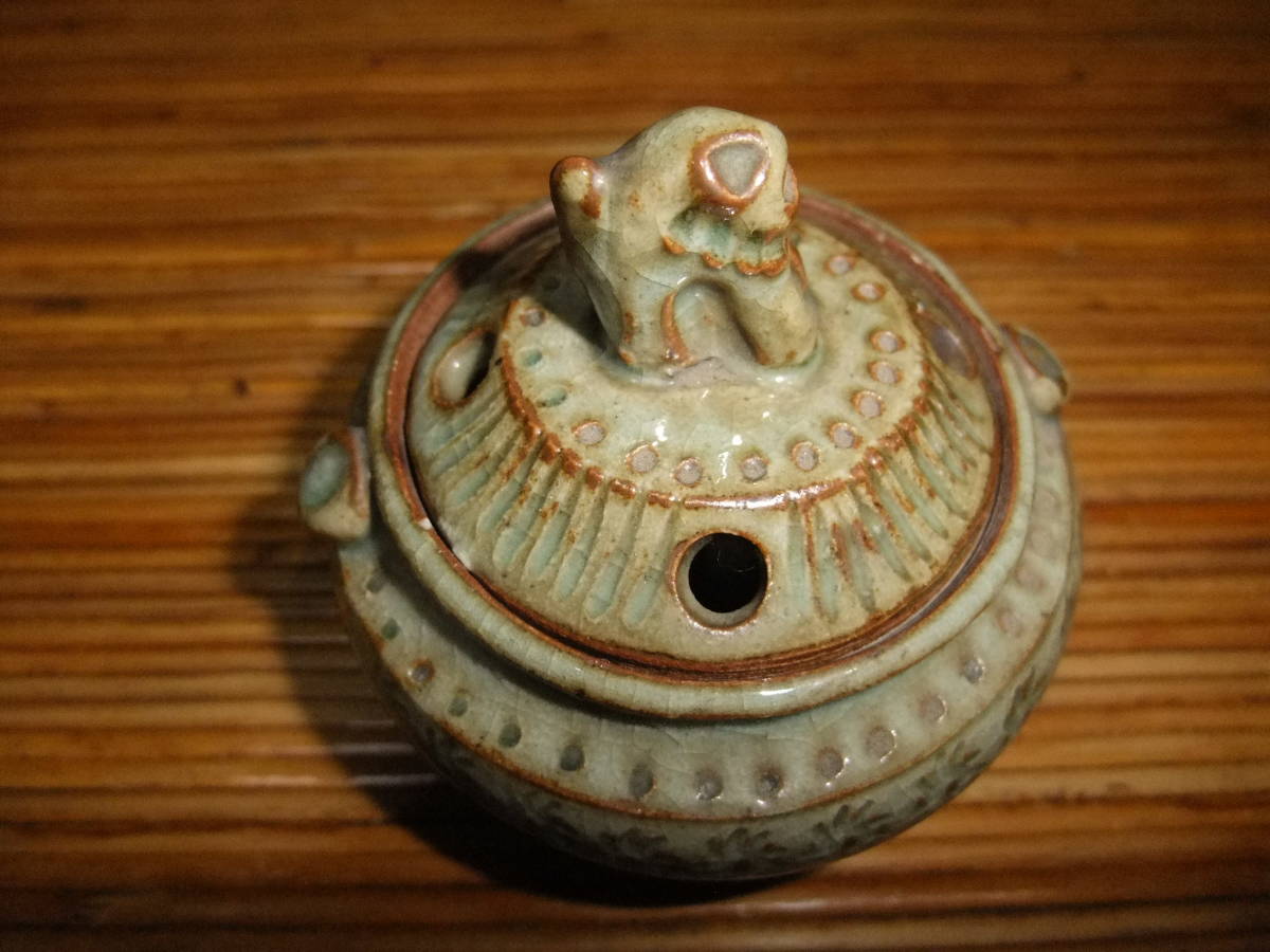 蓋に獅子(?)が付いています。底に北朗の銘が入っています(内島北朗)。箱には青?(字が読めません)香炉 北朗[喜]と墨書きがあります。箱に,灼け,汚れがあり時の経った感があります。