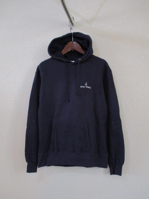 商品紹介 | ネイビーのプルオーバー(被り式)タイプのパーカーです。 左胸の白いプリントがポイントになっています。 《素材》 綿100% |