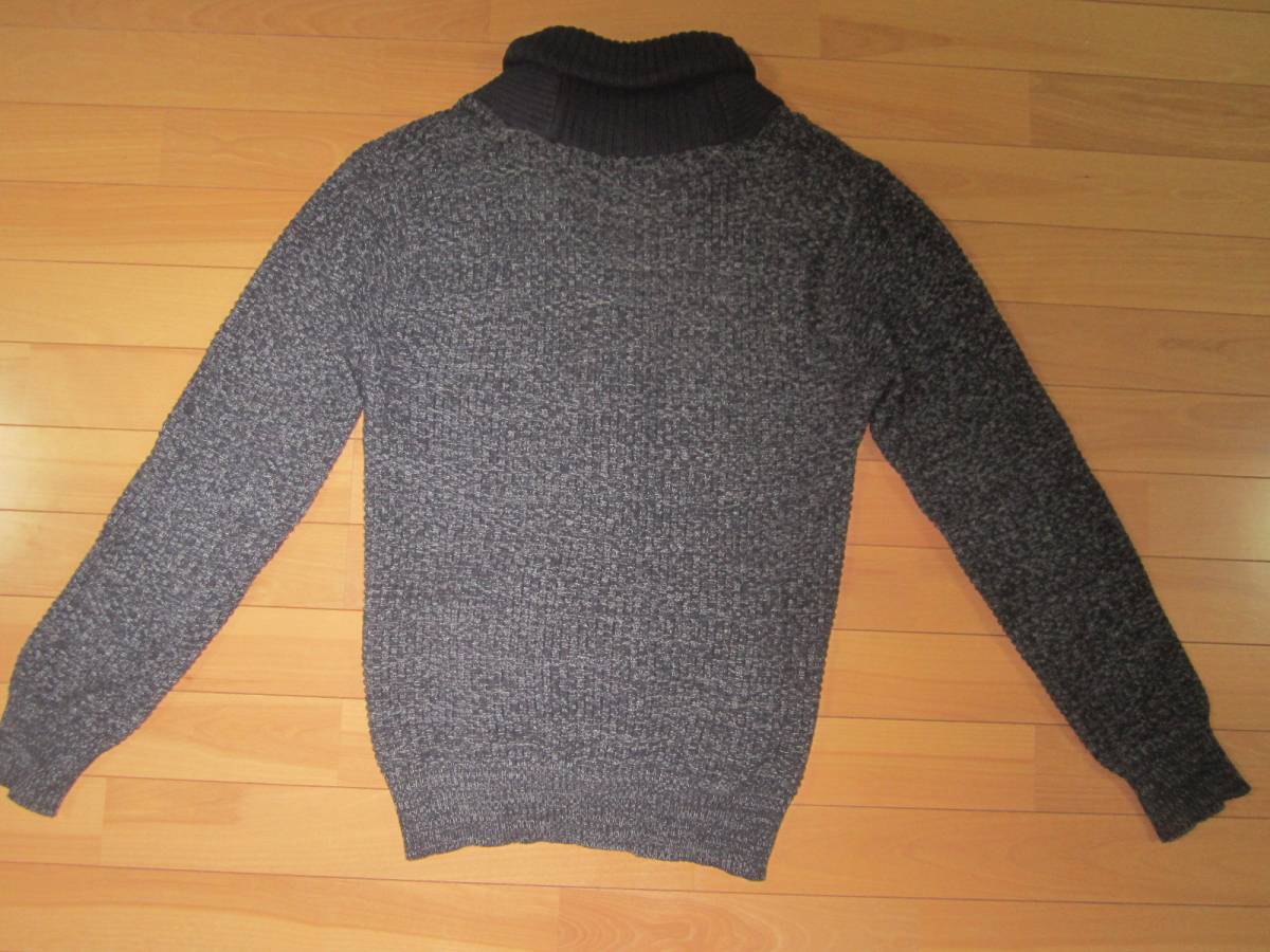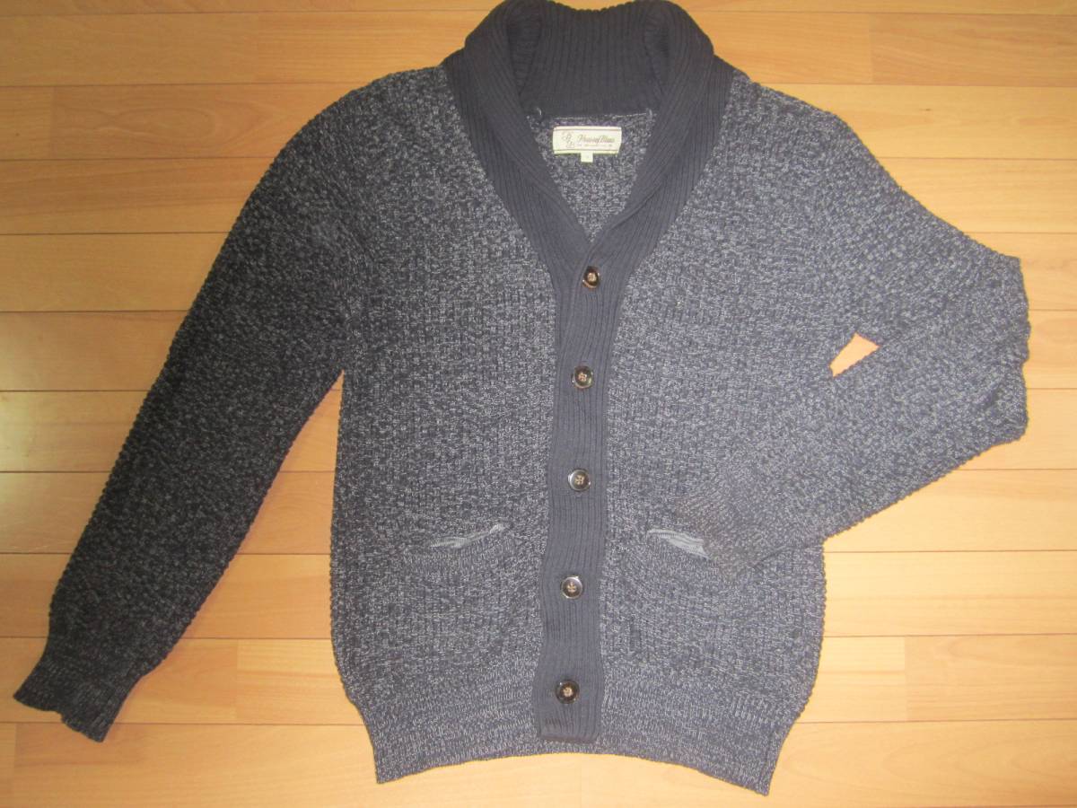 本体は綿100%ニットでリブ編みブルーグレーのショールカラー、