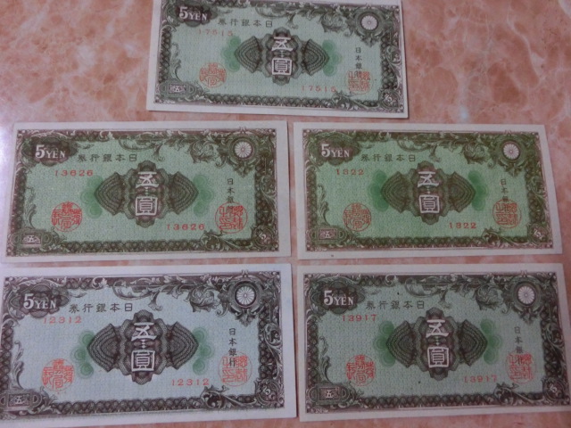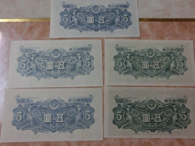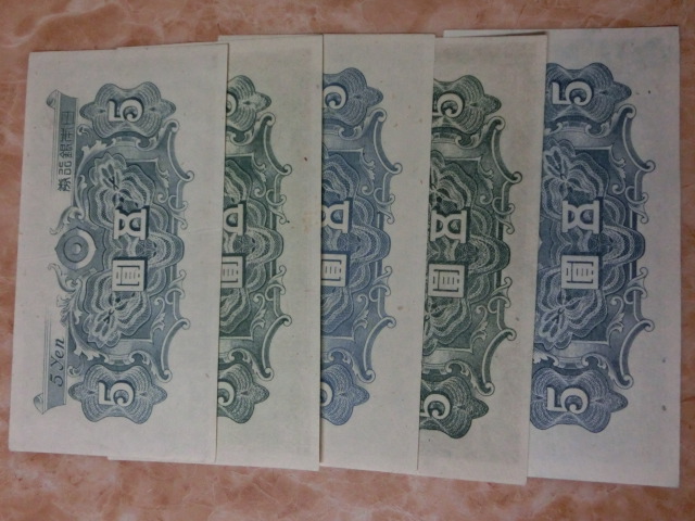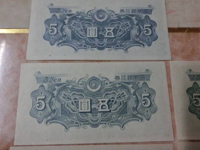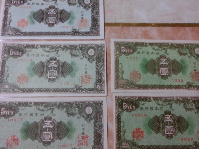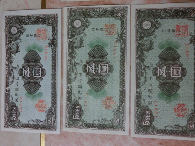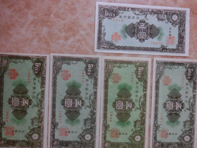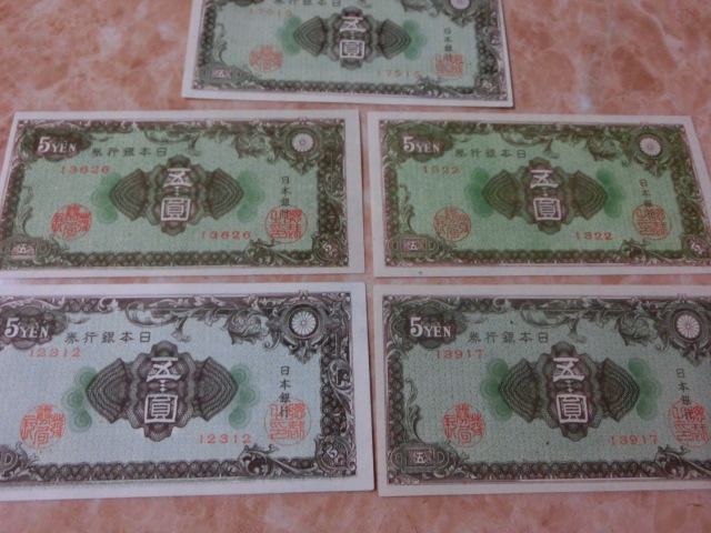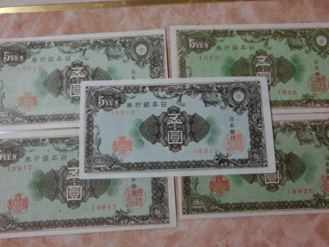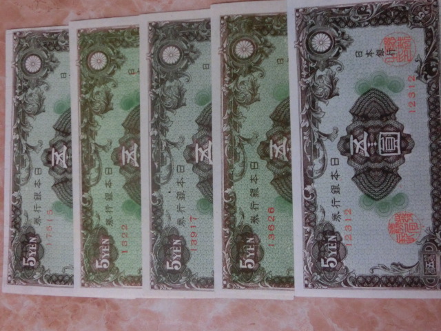 日本銀行券 A号5円 彩紋5円の未使用~極美品を全5印刷工場5枚セットです。