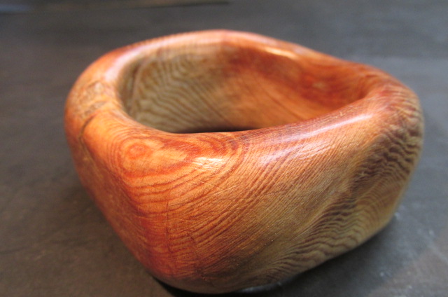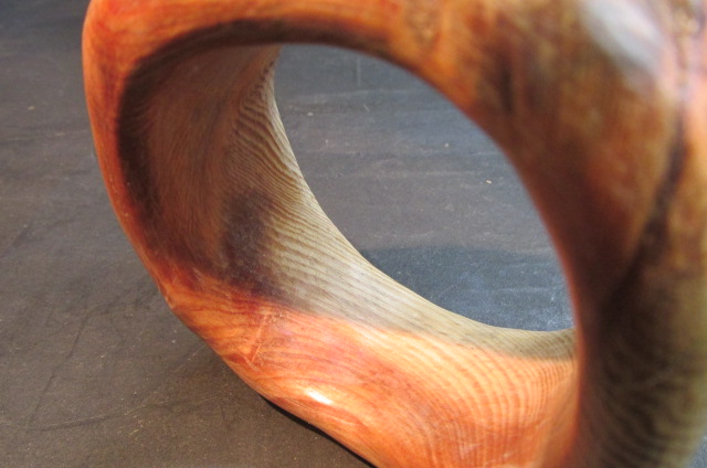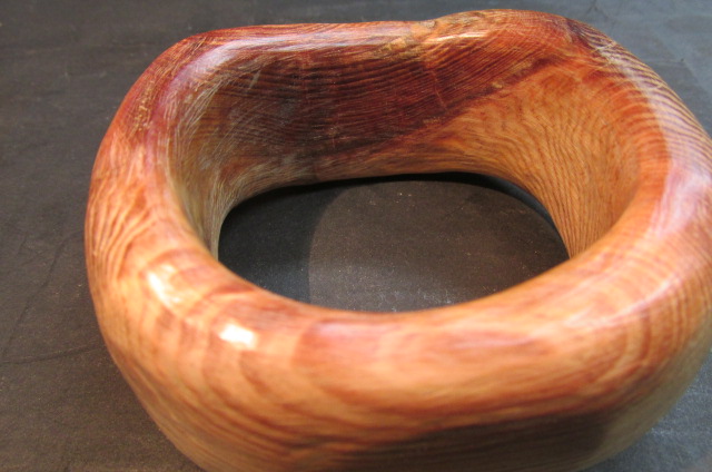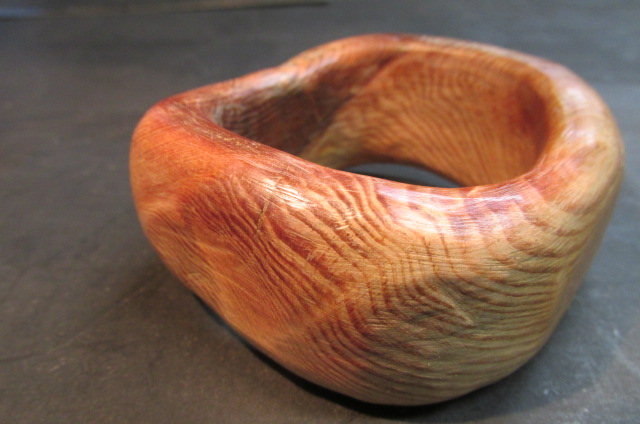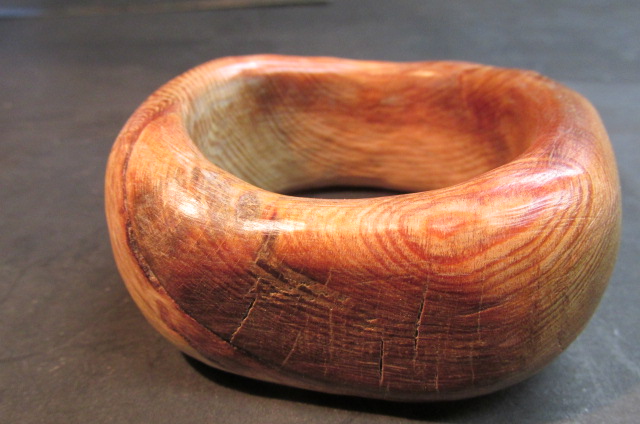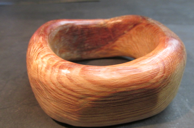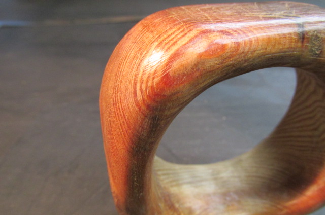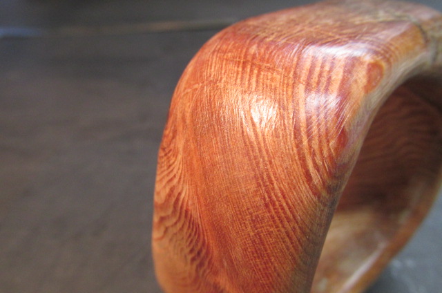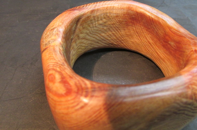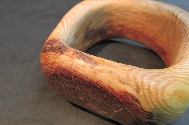 厚さ4cmの脂をたっぷり含んだ肥松のブロックを使ってくり抜きでバングルを作りました。仕上げは溶かした蝋を浸み込ませて仕上げる蝋仕上げで仕上げました。
